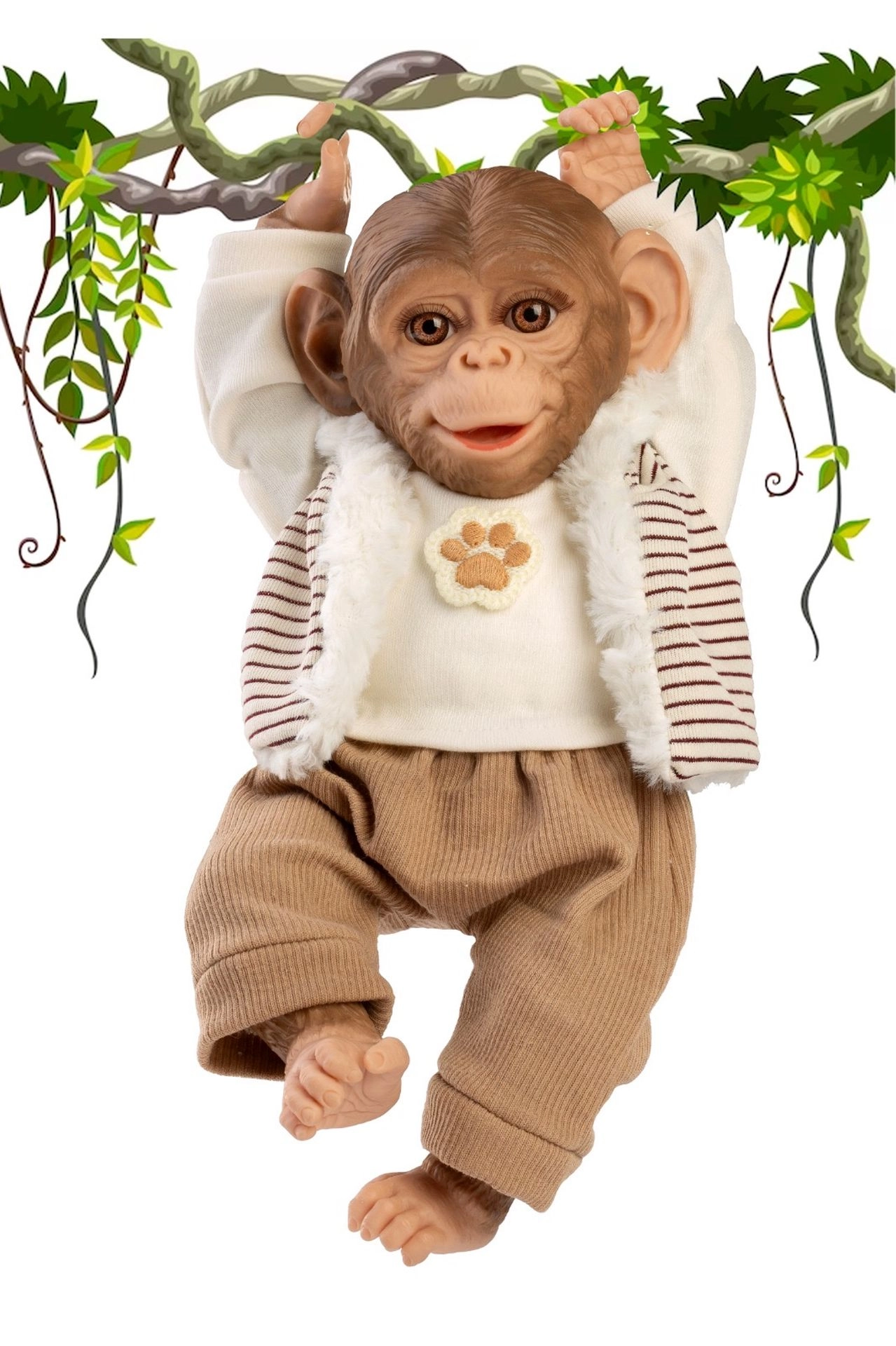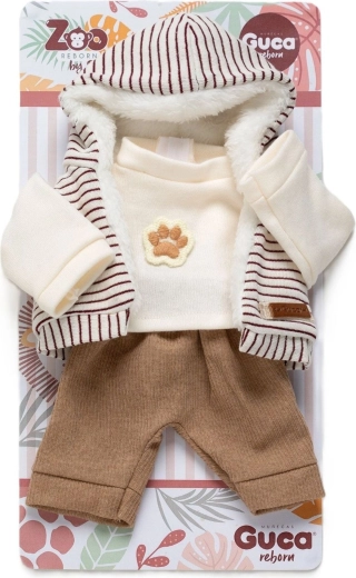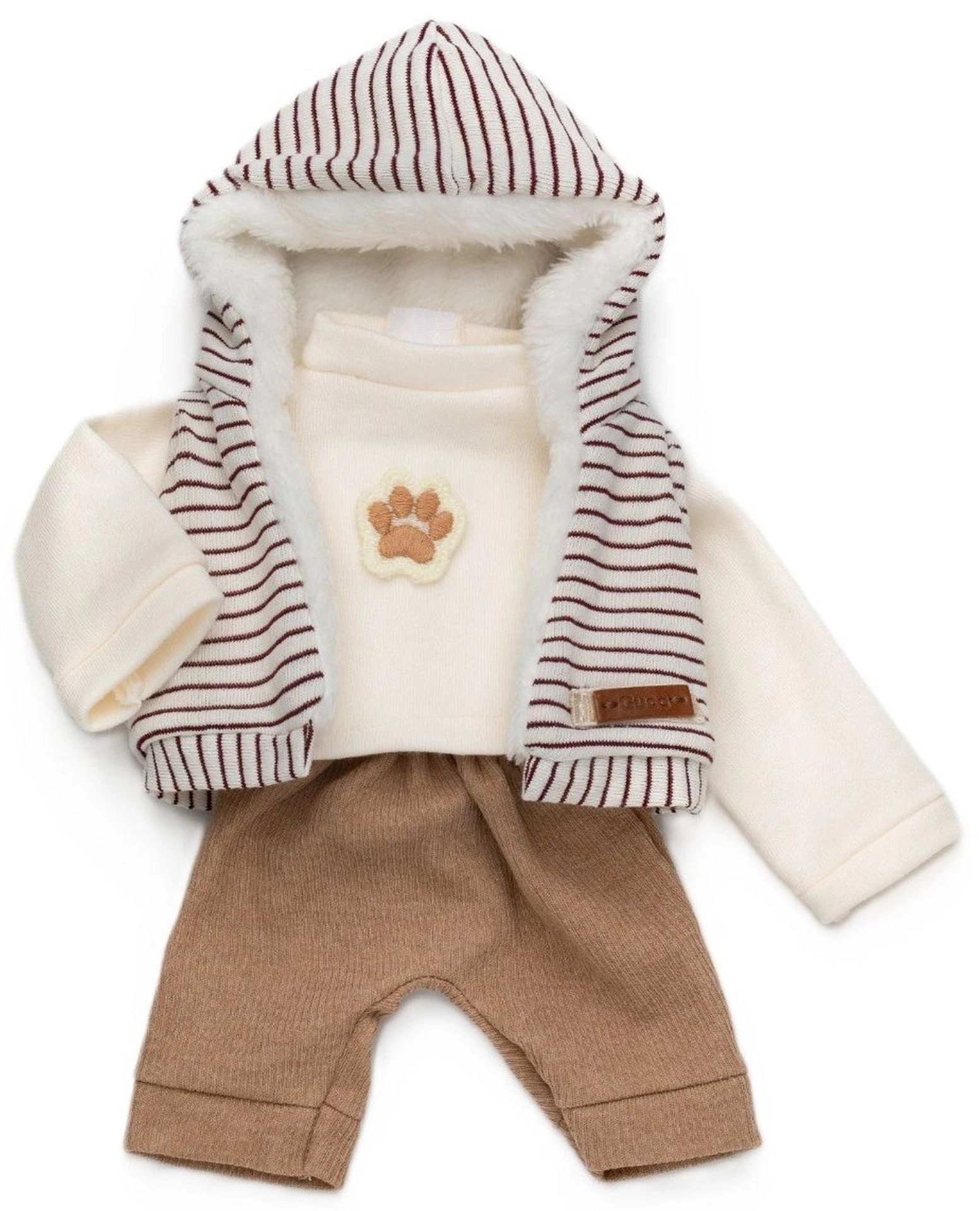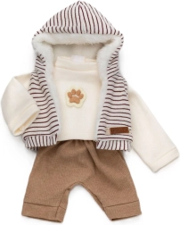 Този стилен комплект за маймунка Reborn 32 см включва три съчетани елемента – кремава блузка с дълъг ръкав и мотив лапичка, раирана жилетка с качулка и топъл пух, и удобни панталонки. Тоалетът е проектиран за лесно обличане и събличане, за да могат децата бързо да променят визията на любимата си играчка.