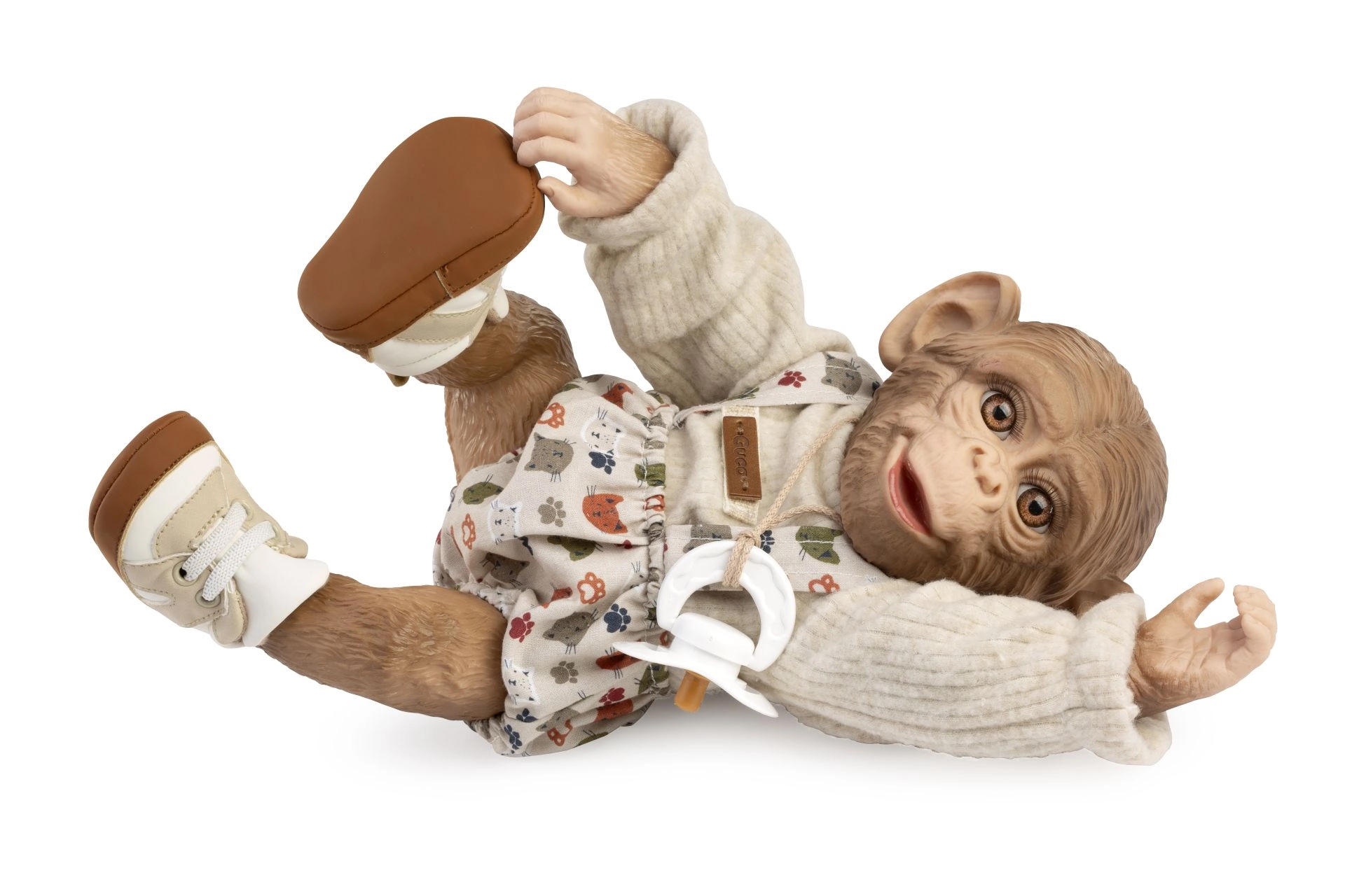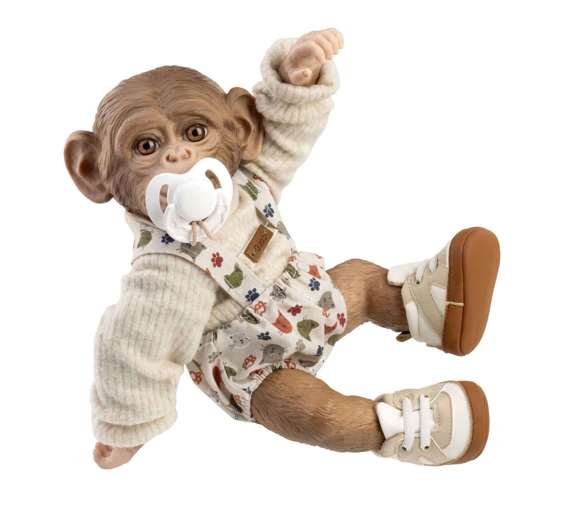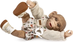 Две части облекло и обувчици създават хармоничен аутфит за маймунче бебе REBORN с размер 32 см – готово за игра веднага след разопаковане.