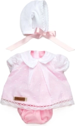 Този елегантен комплект включва розова рокличка с бяла яка и дантела, съчетаващи се панталонки тип bloomer и плетена бяла шапчица с розова панделка. Прецизните детайли, като финно точкувана материя, дантелени кантове и удобни кройки, придават на вашата кукла маймунка Reborn автентична и очарователна визия.