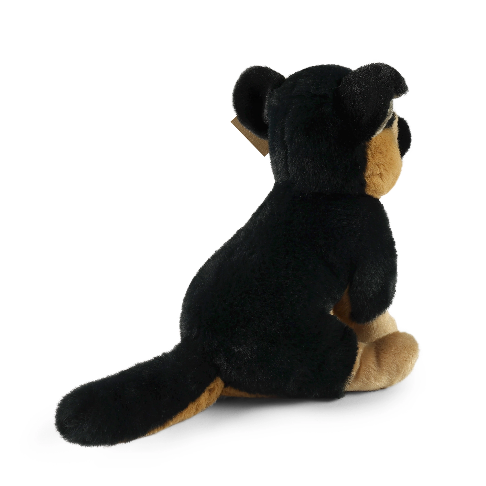 Този седящ немски овчар впечатлява с много мек плюш, прецизна изработка и естествен външен вид. Благодарение на ръчната изработка изглежда като жив и е идеален за гушкане, игра и като декорация в детската стая.