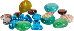 В блока ще откриете гладки, лъскави камъчета в сини, зелени и кехлибарени нюанси и малки мидички. Всеки екземпляр е уникален.