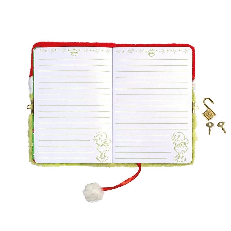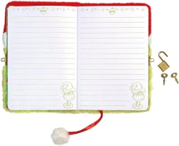 Подарете си радост със стилен тефтер с плюшена корица и ярък мотив GRINCH. Благодарение на формат A5 се побира удобно в раница или чанта, така че винаги да е под ръка. Заключалката с два ключа ще защити вашите бележки, дневник и скици.
