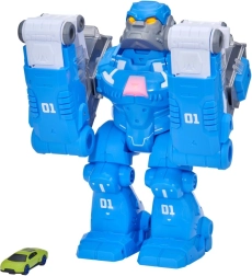 TEAMSTERZ Robo Gorilla съчетава мотив на горила и футуристичен робот в една впечатляваща играчка. Голямото синьо‑сиво тяло с ярки оранжеви LED очи и цифрите „01“ подчертава състезателния вид. Прозрачните панели в ръцете служат като писти, по които можете да следите движението на включената количка.