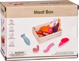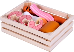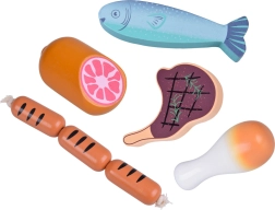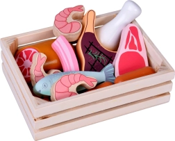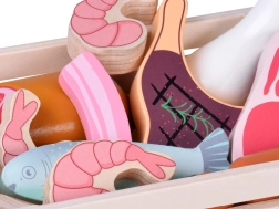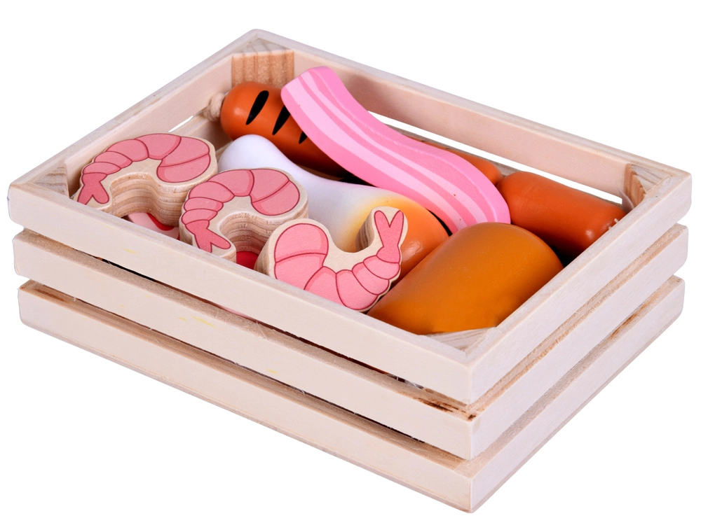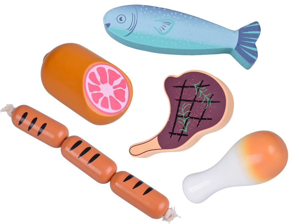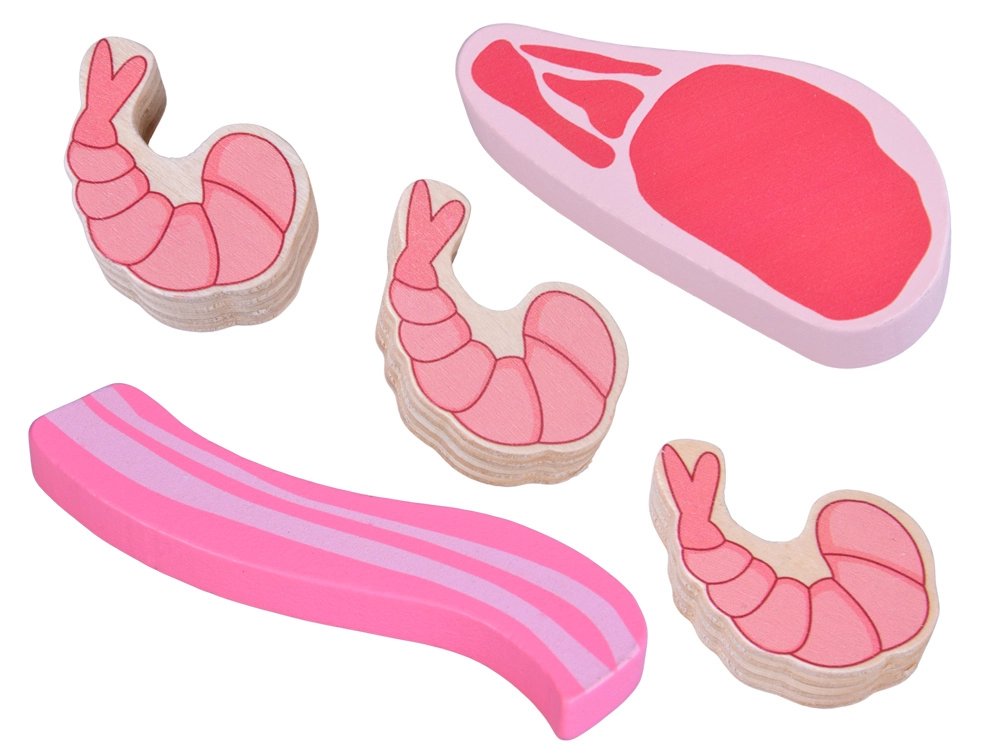 Този дървен комплект храни съдържа всичко, което децата познават от кухнята или магазина: наденички, салам, бекон, стекове, пилешки парчета, риба и скариди. Частите са стабилни, приятно закръглени и детайлно боядисани, за да изглеждат реалистично и същевременно да останат напълно безопасни за игра.