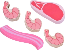 Стек, наденички, салам, бекон, пилешко бутче, гриловано бутче, риба и 3× скарида – пъстра комбинация за безкрайно готвене и игра на магазин.