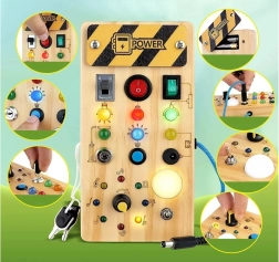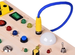 Тази дървена Монтесори активна дъска комбинира практическо учене и сензорна игра. Децата включват кабел, натискат бутони, превключват ключове и наблюдават как цветните LED реагират – така естествено усвояват причина–следствие и тренират фината моторика и координацията око–ръка.