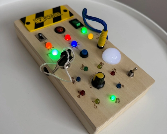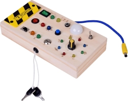 Открийте компактна Монтесори дъска, която развива фината моторика, концентрацията и логическото мислене. Децата ще обикнат светещите LED диоди, превключвателите и бутоните, ключето и въртящото се копче. Безопасно естествено дърво, гладки ръбове и тихо, смислено забавление без екран – идеално у дома и в движение.