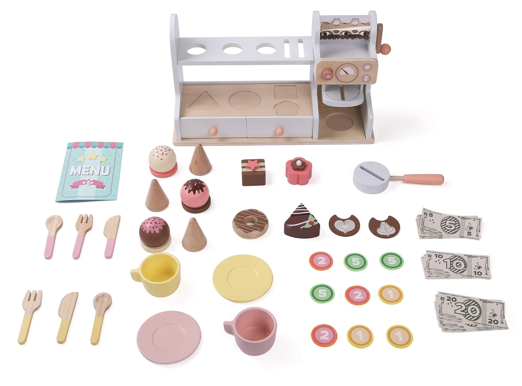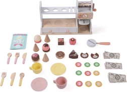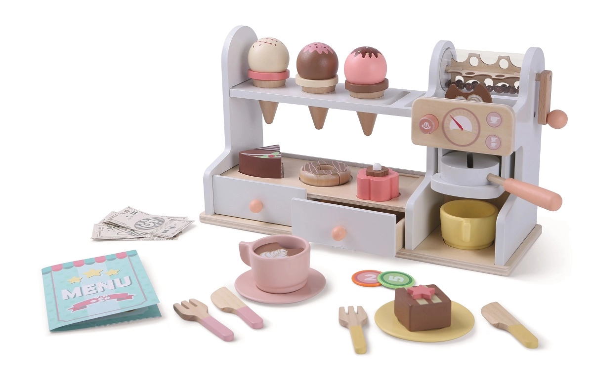 Тази стилна дървена сладкарница и кафене 2 в 1 превръща детската стая в малко бистро. Компактният щанд с кафе-машина, витрина за десерти и полица с отвори за топки сладолед кани на безкрайни часове забавление. В комплекта има и касово чекмедже с фалшиви пари, така че децата могат да тренират обслужване и плащане.