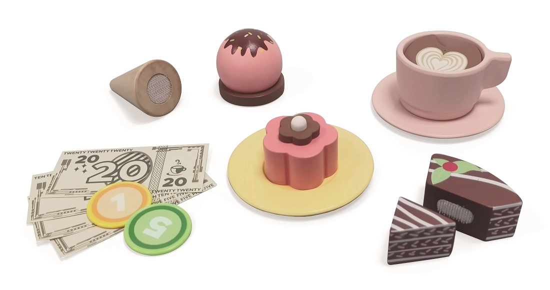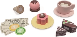 Чашки с чинийки, десерти, топки сладолед, прибори, монети и банкноти – общо 46 части за множество сценарии.