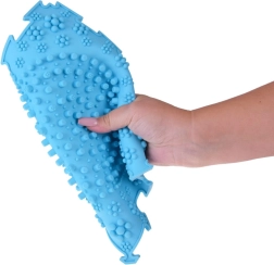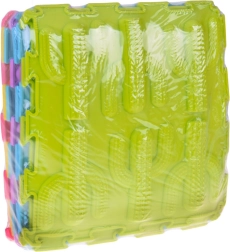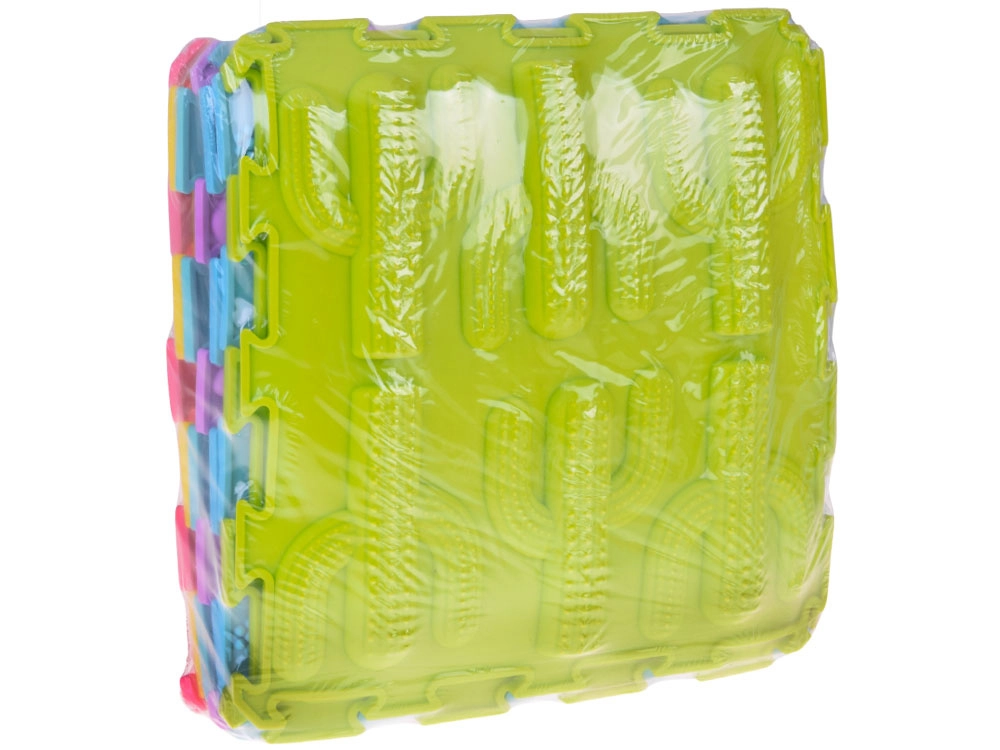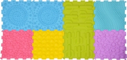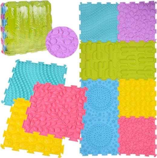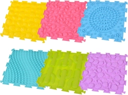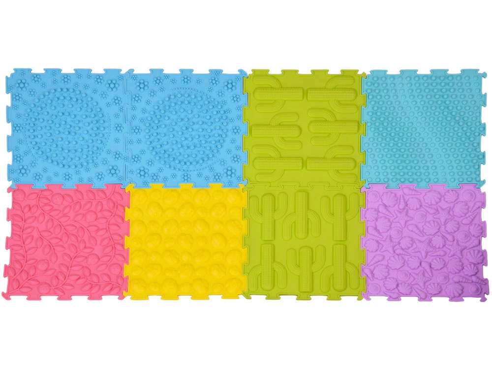 Сензорната постелка от осем свързващи се модула (24,5 × 24,5 cm, дебелина ок. 1 cm) предлага разнообразни текстури – кактуси, листа с калинки, миди, цветя и различни куполи и точки. Отделните части могат да се комбинират свободно и да се подредят в правоъгълник, лента или почти квадрат, така че лесно да адаптирате постелката към пространството и дейността.