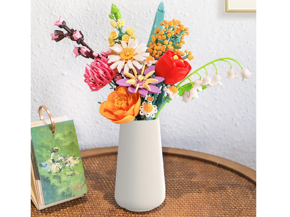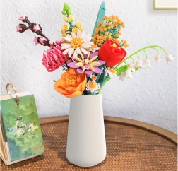Този дизайнерски сет комбинира креативно сглобяване с модерна домашна декорация. В кутията ще намерите всичко за създаване на пъстър цветен букет – от дребни маргаритки до впечатляващи хризантеми, всичко допълнено от матова керамична ваза, която осигурява стабилност и изчистен вид на аранжировката.