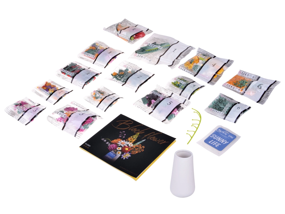 Конструкторът е разделен в номерирани пликове и е допълнен с илюстрован наръчник стъпка по стъпка, подходящ за опитни и начинаещи. Готовият букет е висок приблизително 30 см, идеален за маса, рафт или скрин и осигурява часове релаксиращо и креативно забавление.