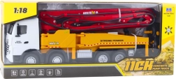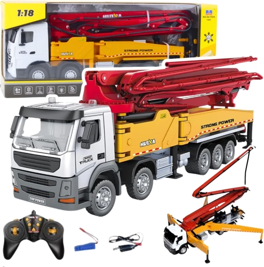 Реалистична RC бетонпомпа HUINA в мащаб 1:18, която носи страхотно изживяване за феновете на строителните машини. Предлага 11 канала за пълен контрол, въртяща се платформа 630°, телескопична стрела до 120 см, стабилизиращи подпори и функция за водна мъгла. Благодарение на 2.4 GHz управление, светлинни и звукови ефекти и мощен акумулатор забавлението е реалистично и продължително.