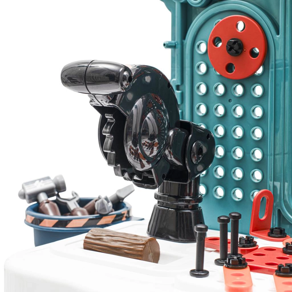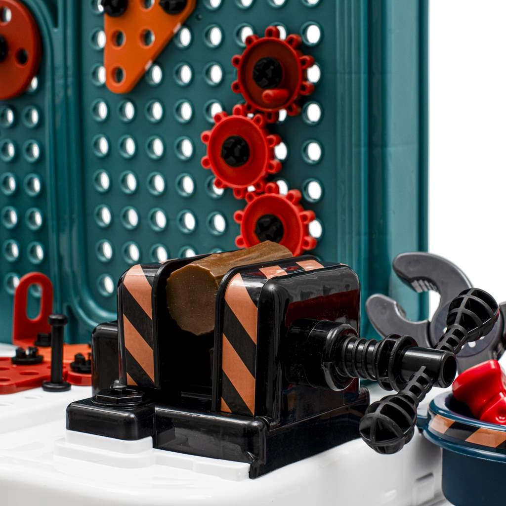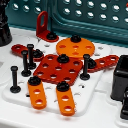 Комплектът със 103 части позволява завиване, фиксиране, рязане и „пробиване“ в рамките на оригинални проекти. Работилницата е компактна, лека и лесна за поставяне в детската стая. Отличен избор за развитие на моторика, въображение и първи трудови навици.