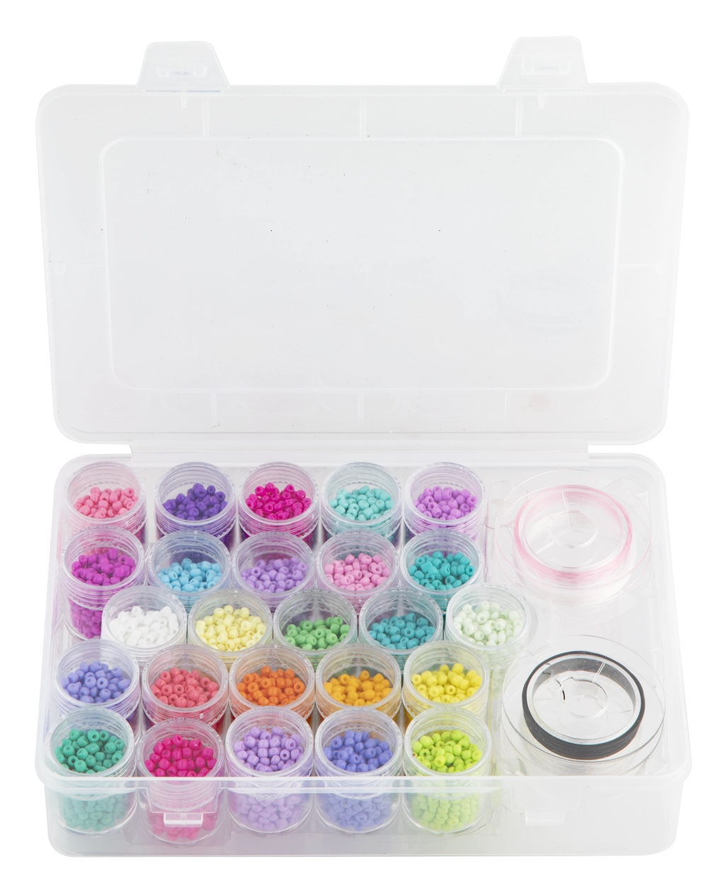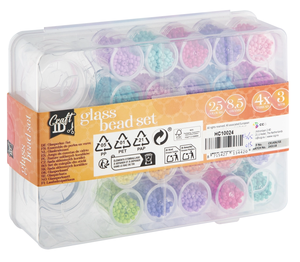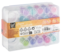 Този голям комплект стъклени мъниста предлага богат избор от 25 цвята за вашите креативни проекти. Благодарение на прозрачния органайзер с отделения имате всички нюанси подредени и на една ръка разстояние, за да комбинирате бързо цветовете за уникални дизайни.