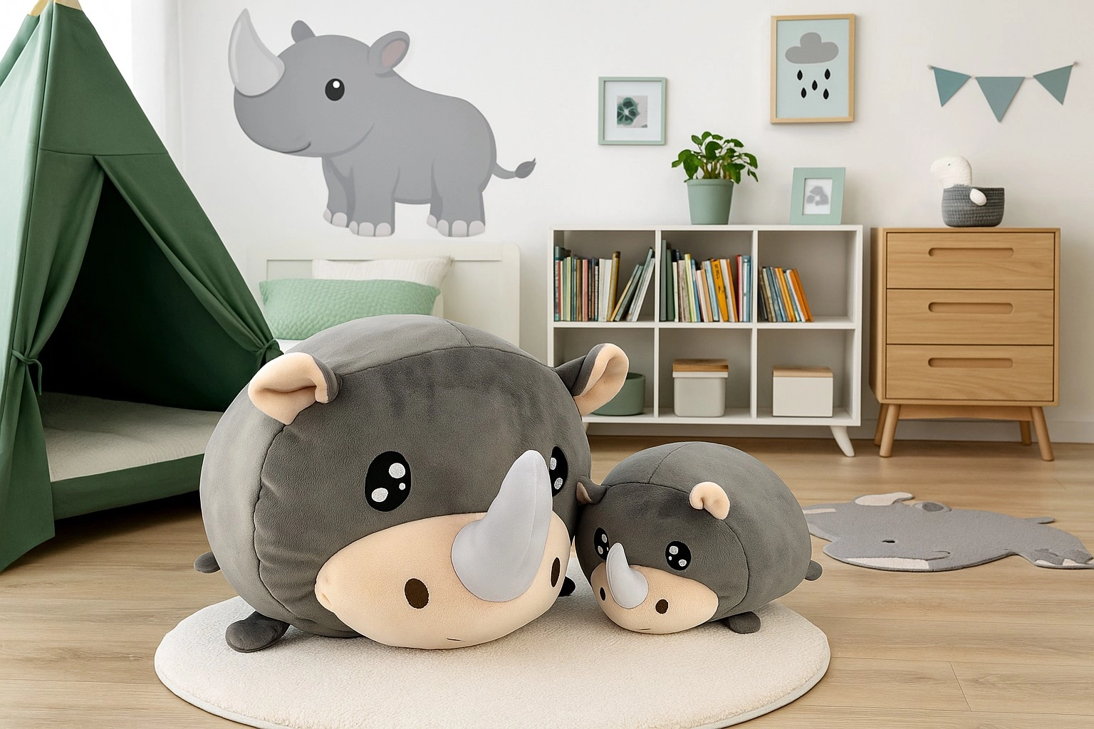 По-малкият носорог (20 см) е идеален за количка или кошче като гушкач, а по-големият (40 см) е подходящ като възглавничка за кола, за път или като уютна декорация за детската стая. Поддръжката е лесна – достатъчно е да се изпере на 30 °C.