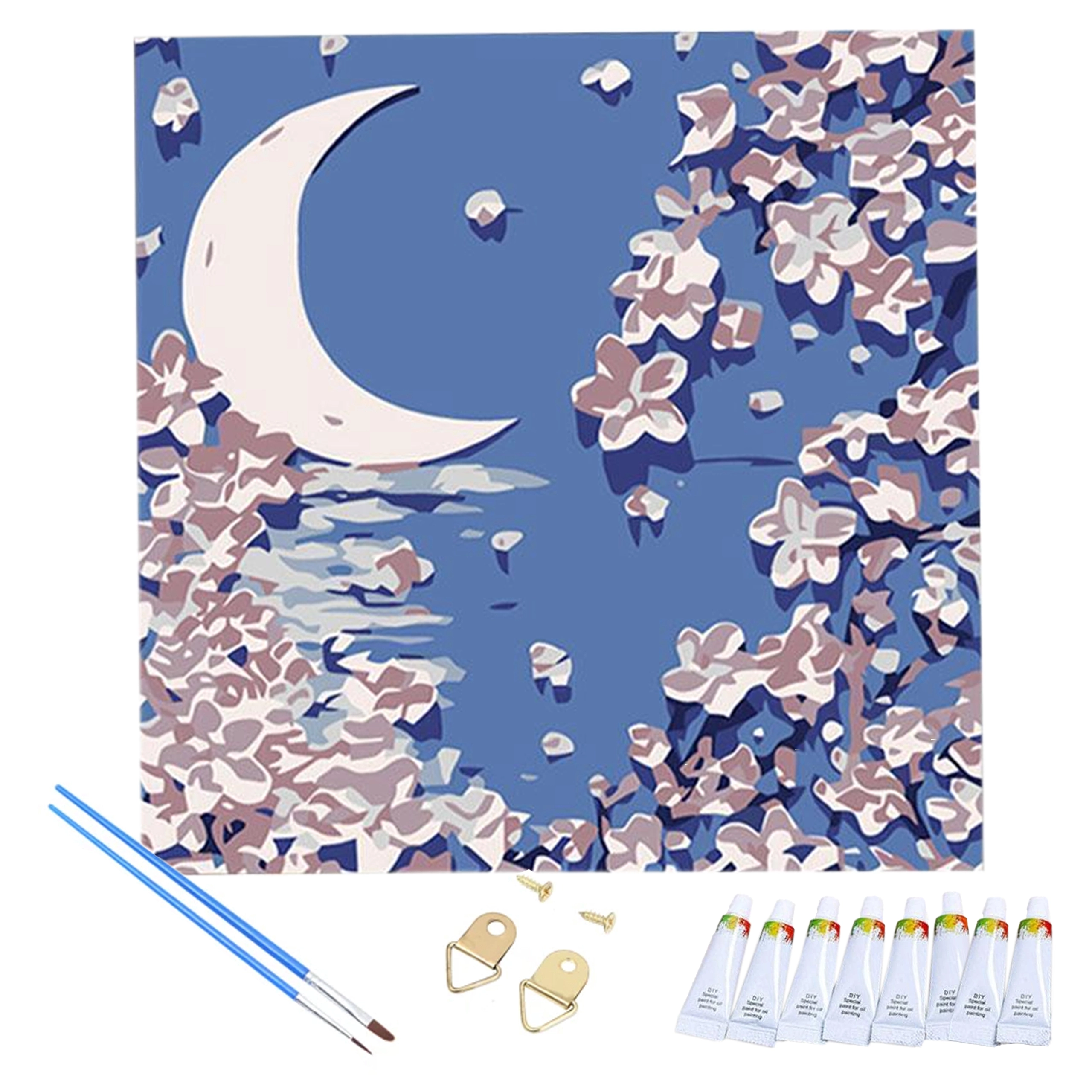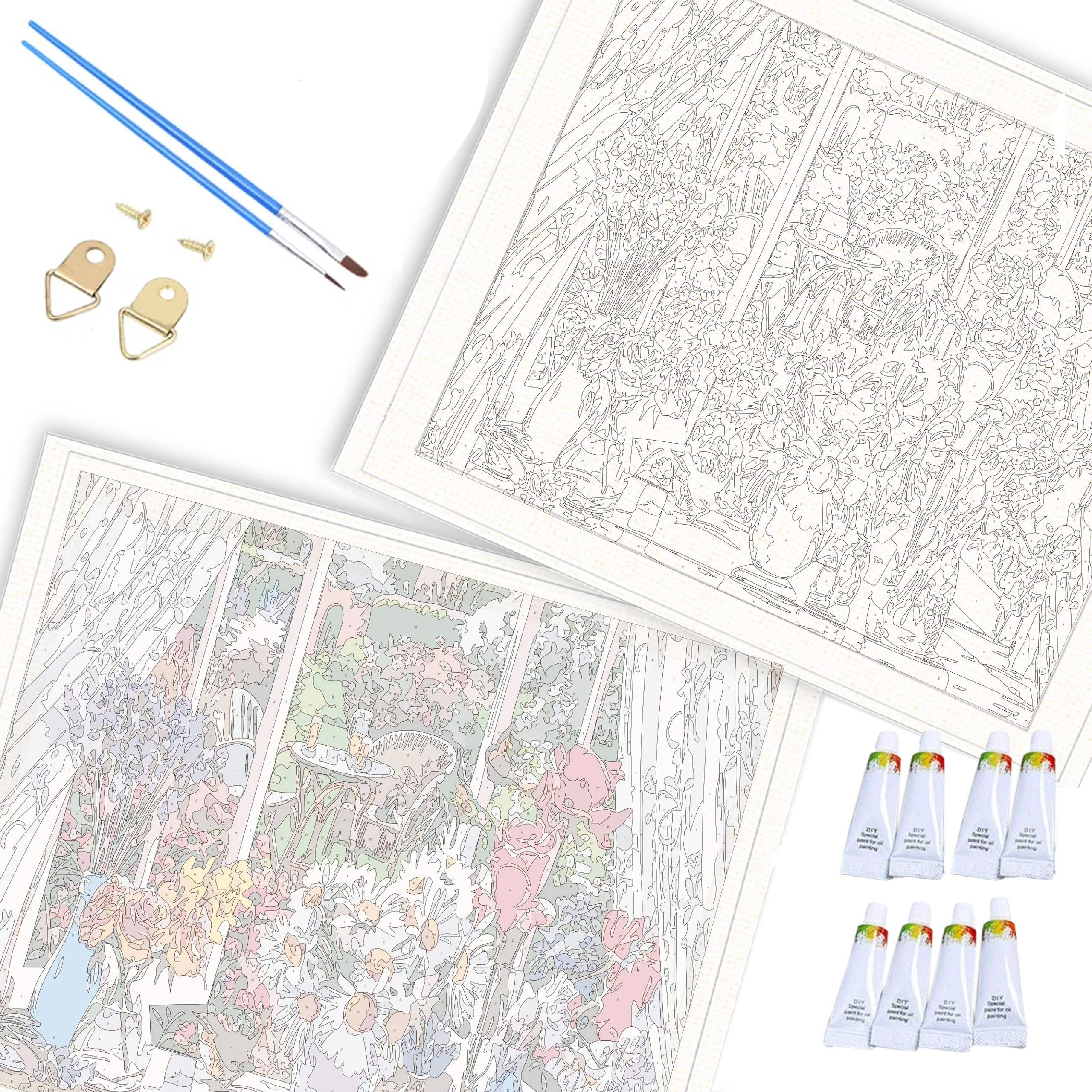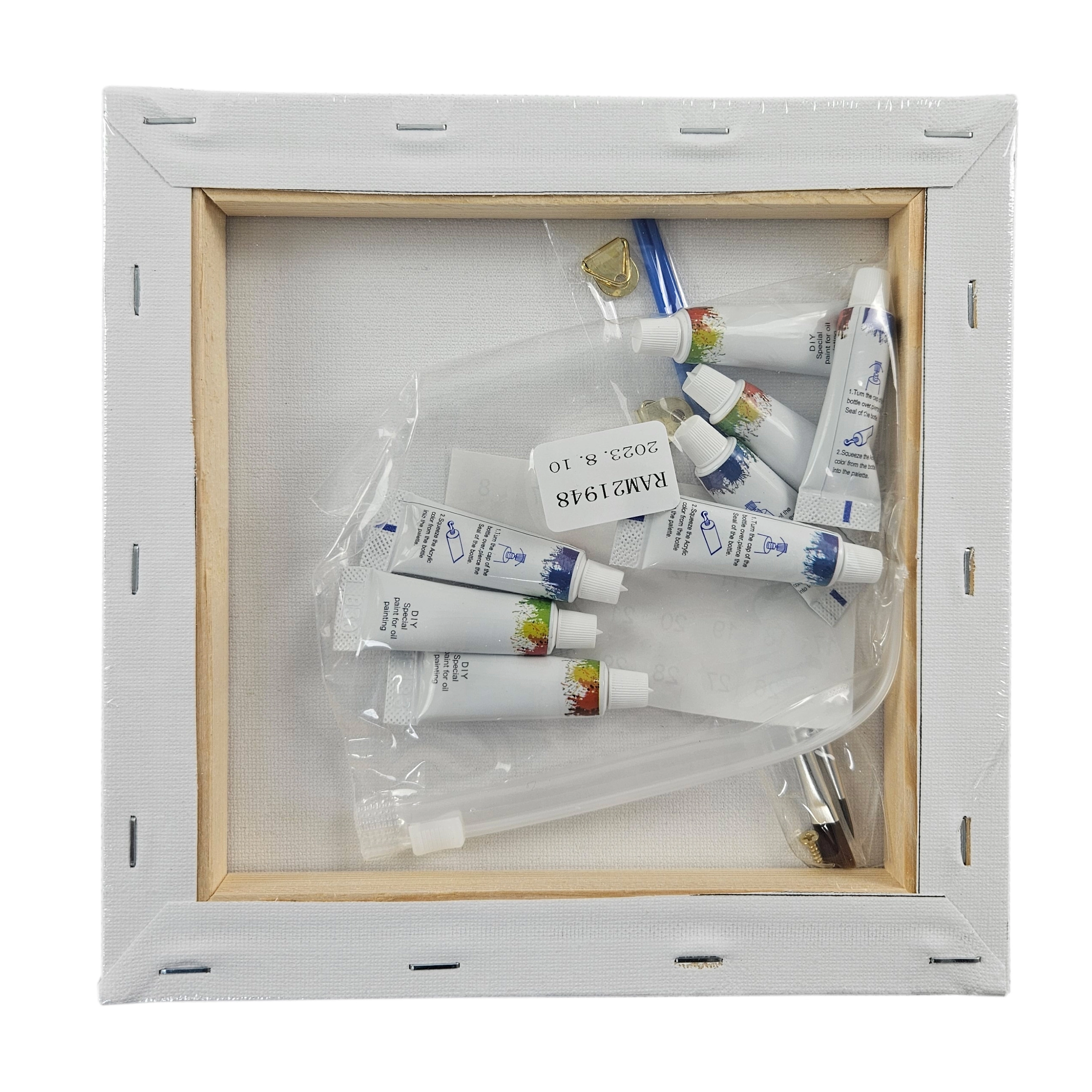 Комплект с номерирано платно, акрилни бои, четки и окачващи аксесоари. Започнете да творите веднага след разопаковане.