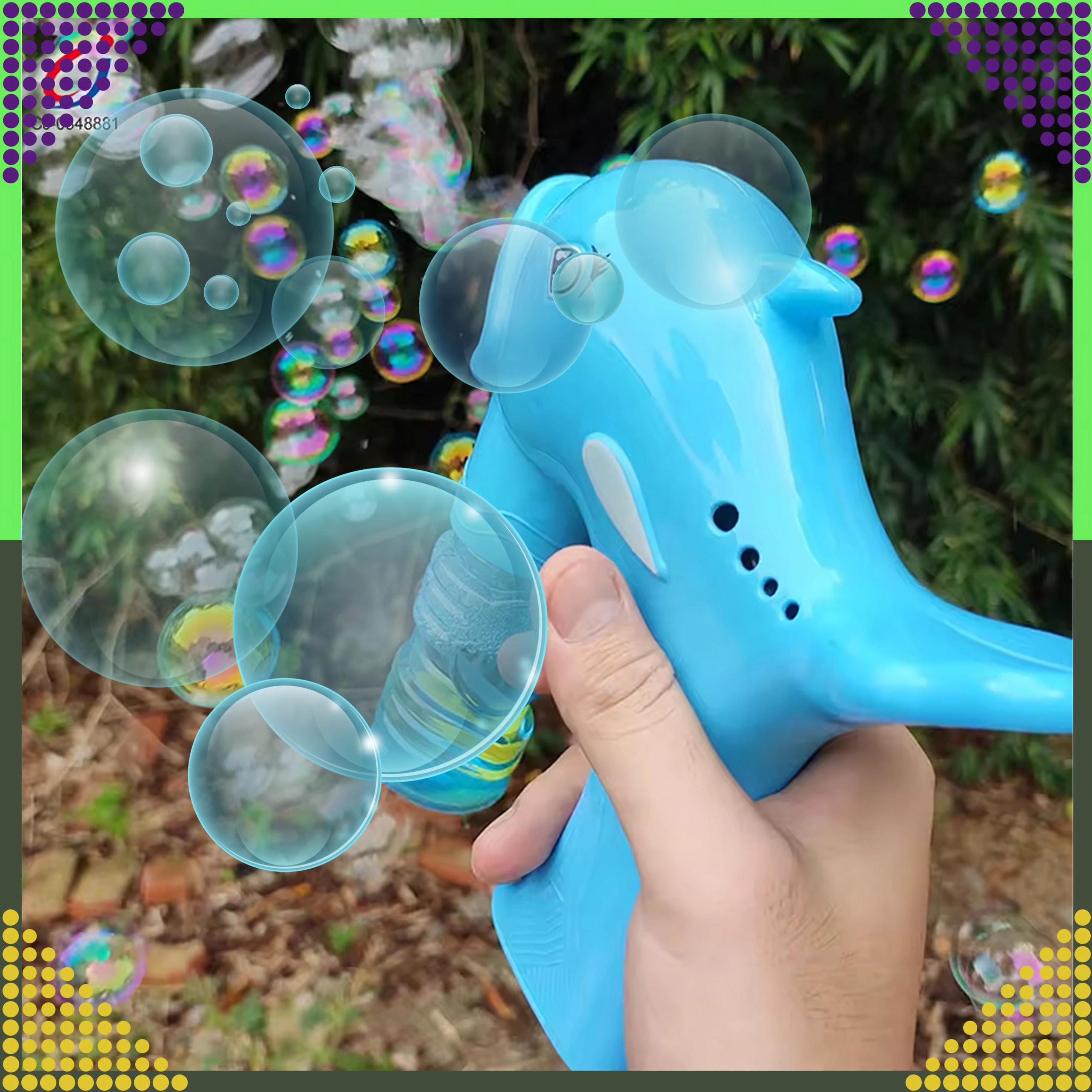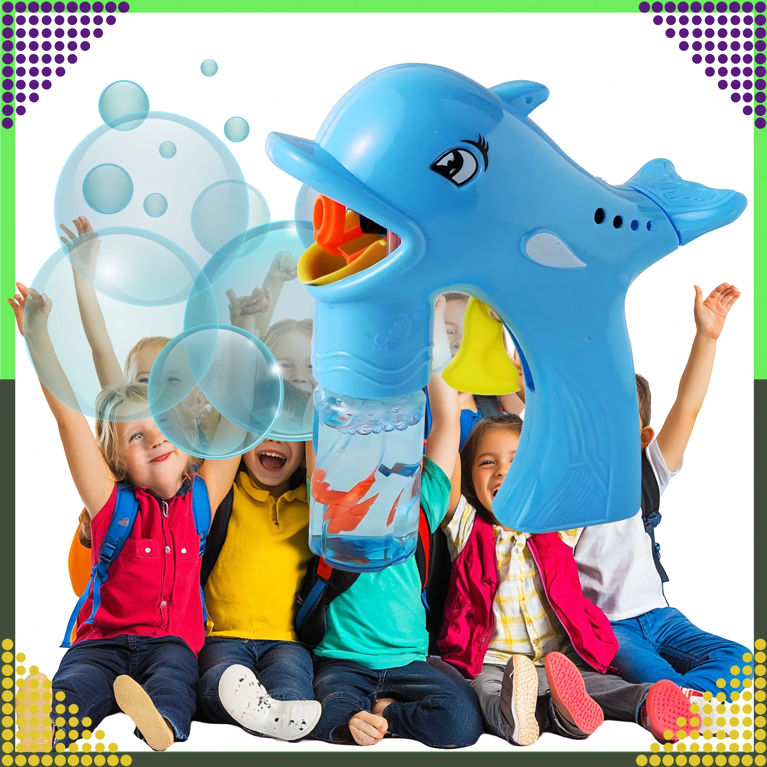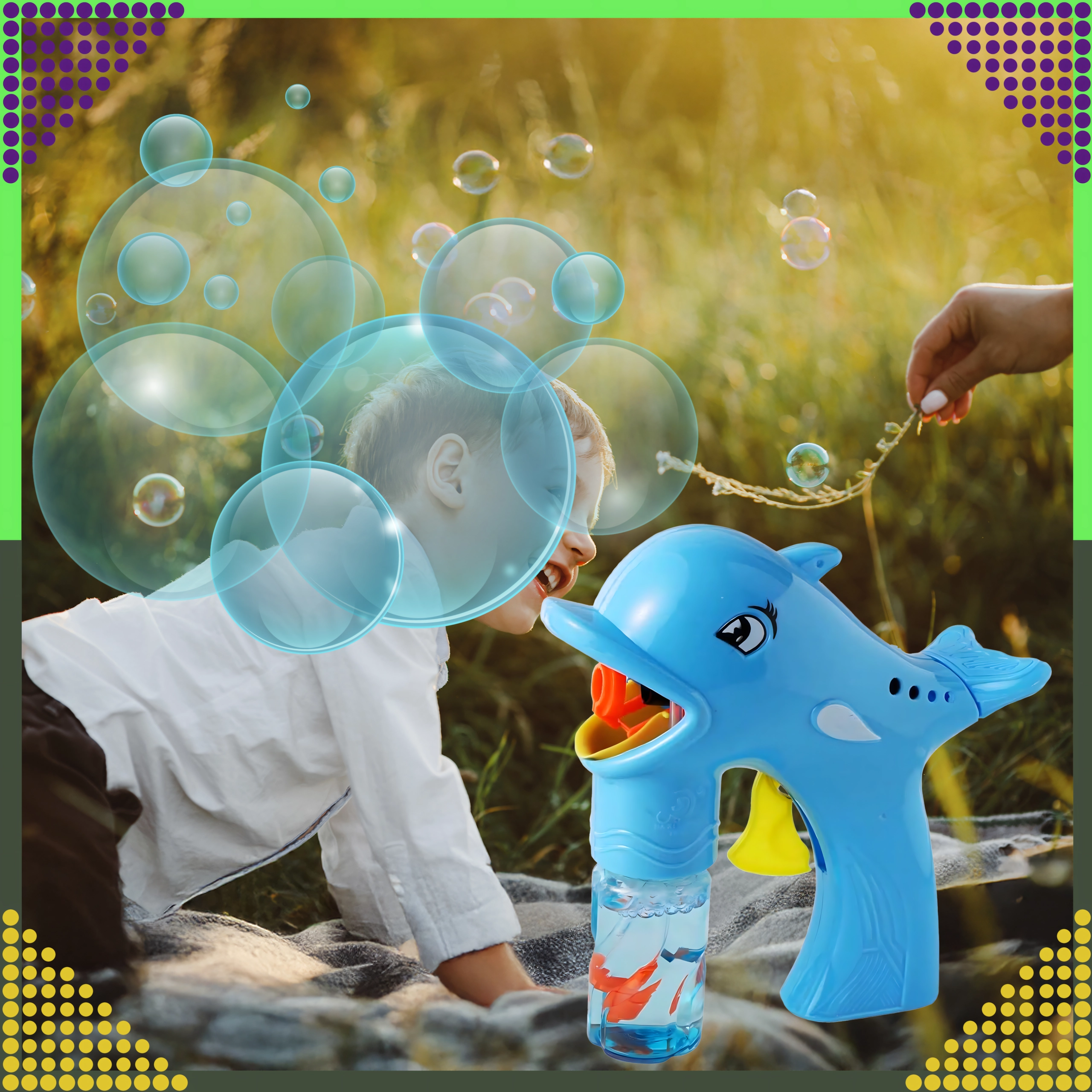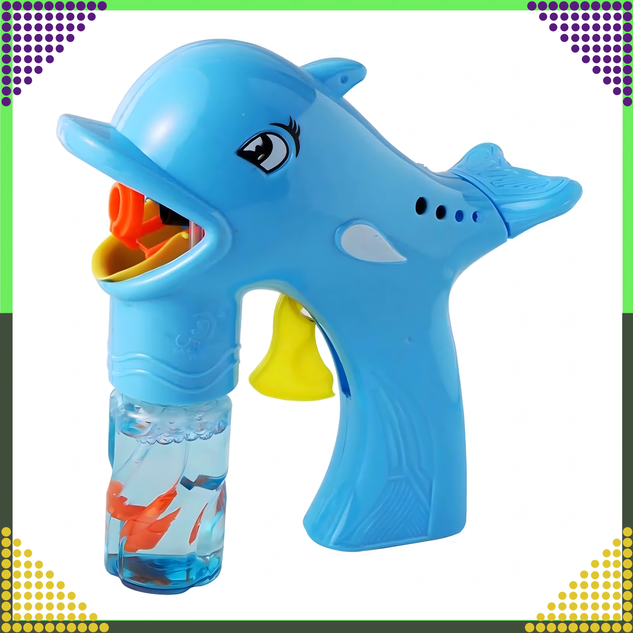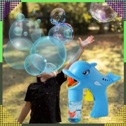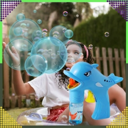 Оживете всяка детска следобедна игра с балончета! Пистолетът за сапунени балончета във формата на делфин, след завиване на шишенцето с разтвора, изстрелва десетки до стотици балончета за няколко секунди. Достатъчно е да завиете пълнителя, да натиснете спусъка и да се наслаждавате на дъгово шоу на открито и у дома.
