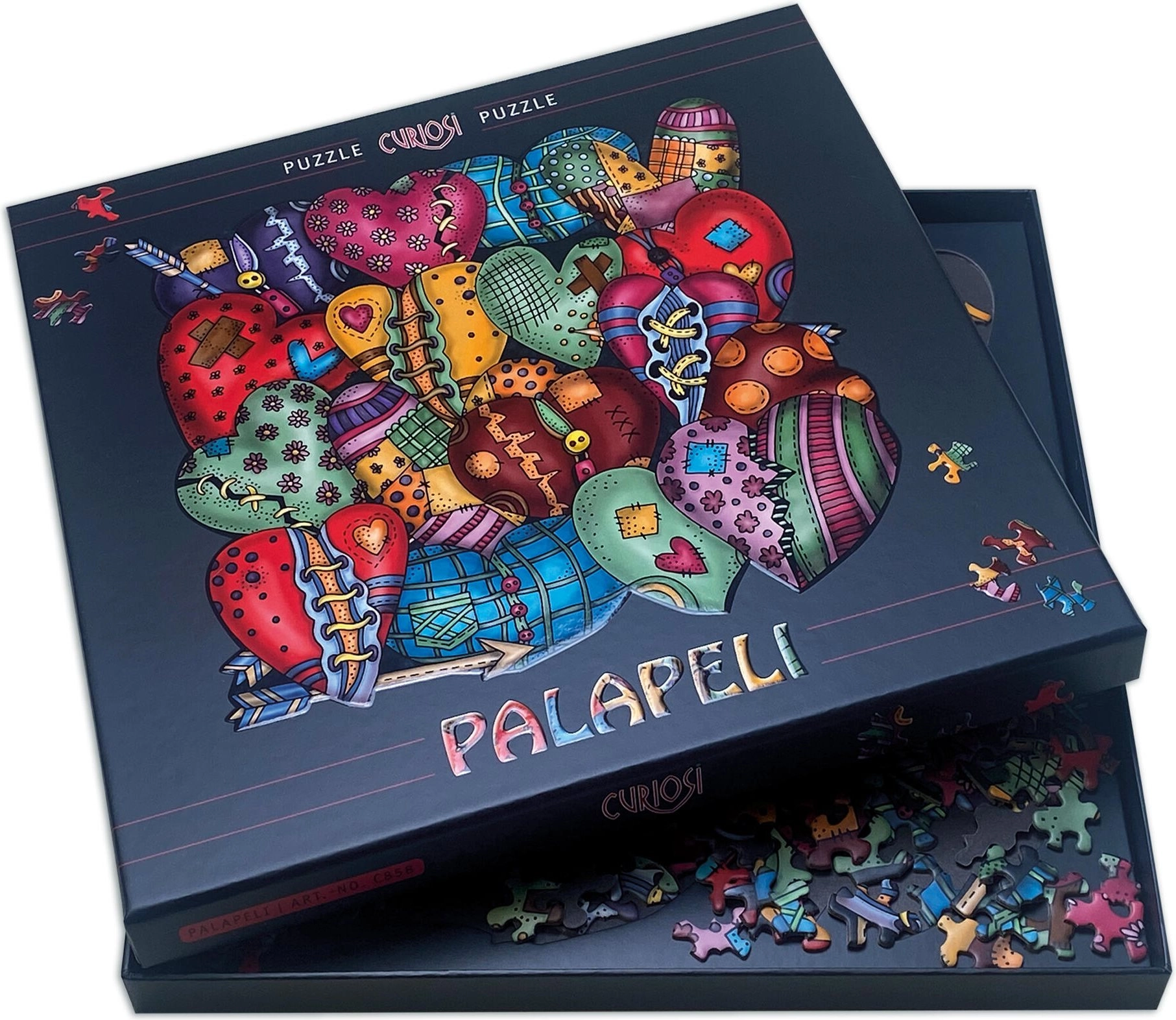 Открийте уникалните квадратни пъзели Palapeli с мотив сърце, които впечатляват с оригинален дизайн и нестандартно оформени елементи. В комплекта е включена и подложка за поставяне или окачване на стена – страхотна идея за подарък. Размерът на сглобената картина е приблизително 28 × 28 cm. Насладете се на креативен релакс с качествена изработка и оригинален ръчно създаден мотив, нестандартни форми на елементите и стилна презентация на готовото произведение.