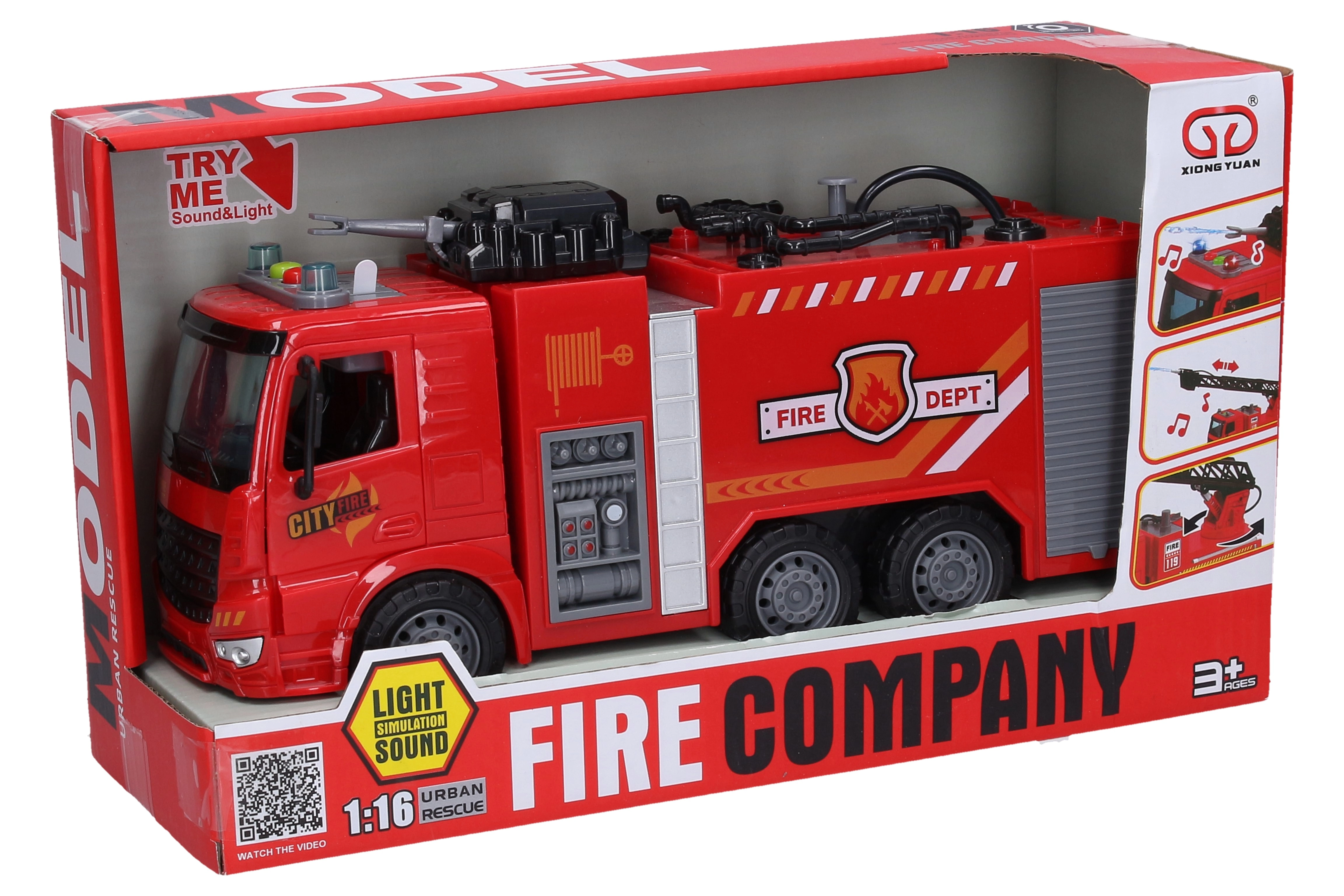 Този детайлно изработен пожарен автомобил носи на децата много екшън: след напълване на резервоарчето вътре в цистерната, с натискане на бутона на резервоара може наистина да пръска вода. Бутоните на кабината активират светлинни и звукови ефекти, които усилват изживяването и насърчават фантазията на малките спасители.