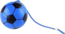 Търсите универсална топка за деца, която забавлява в двора, на игрището и у дома? Тази синя гумена топка с футболен дизайн се отличава с отличен отскок, ниско тегло и издръжлив материал. Практичният фиксиращ пръстен позволява да прикрепите връв или спирала и да разширите игрите с тренировки за рефлекси и ловкост.