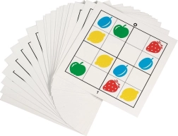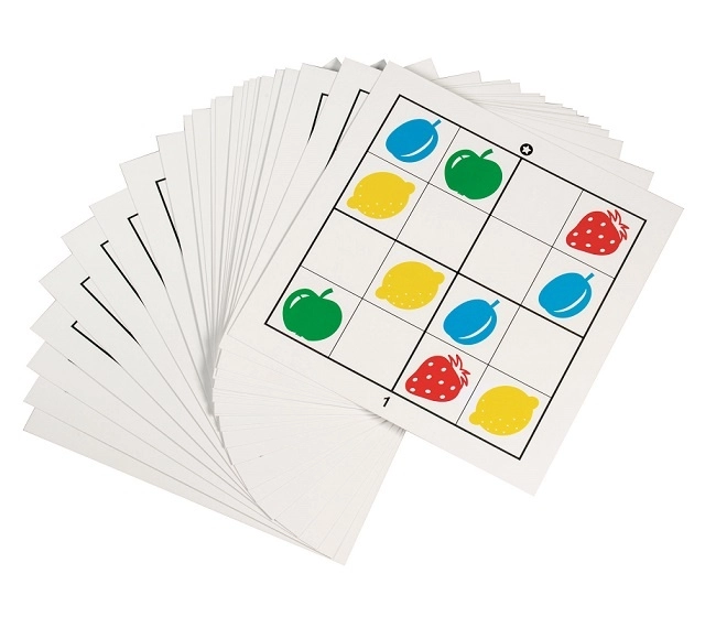 Този умен вариант на судоку за най-малките предлага лесни правила и много забавление. Децата допълват празните квадратчета в мрежа 4×4 така, че еднакви картинки да не се повтарят в ред, колона или квадратче – както при класическото судоку, но с весели плодови изображения.