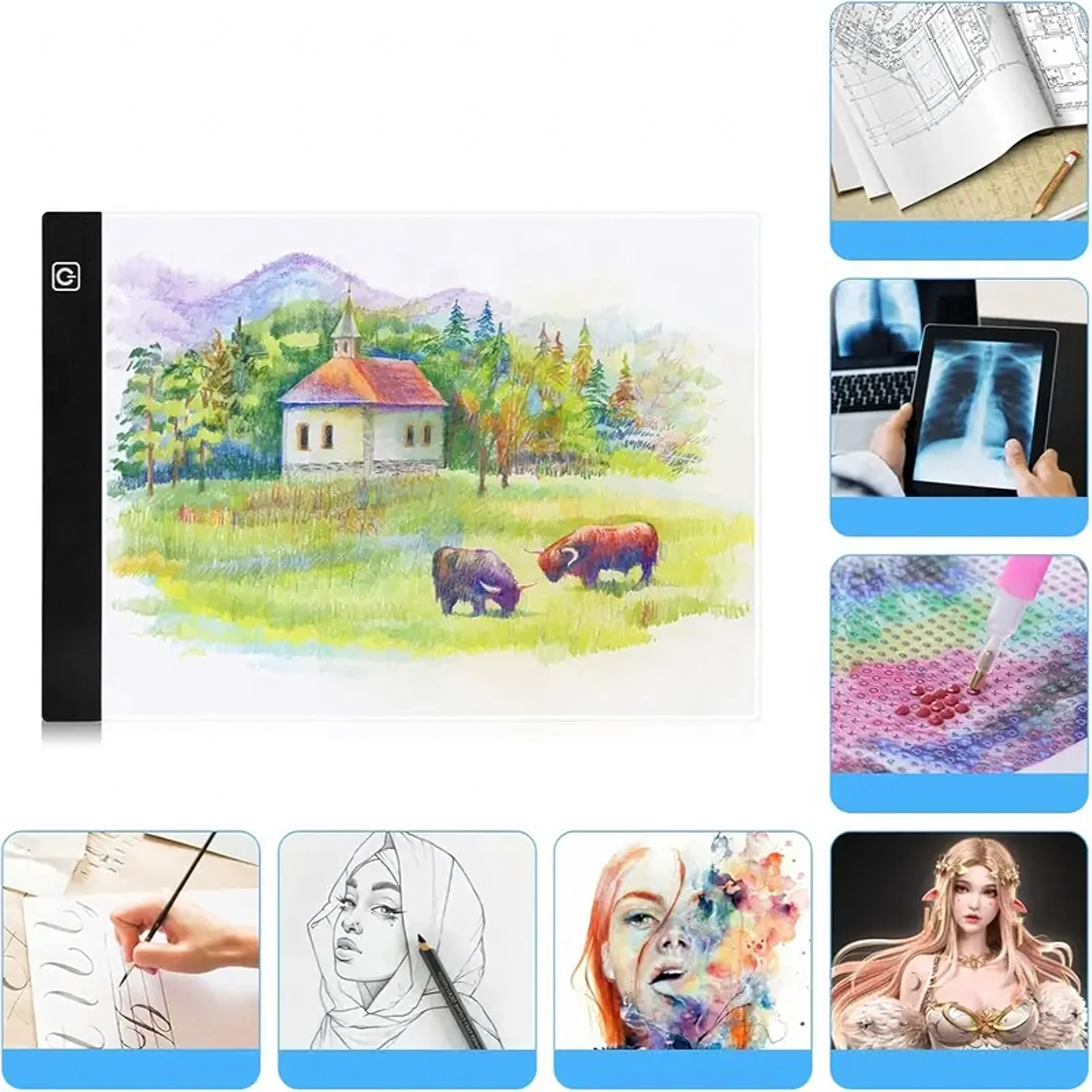 Плочата е отлична за художници, архитекти, татуисти, аниматори и любители на diamond painting. Здравата акрилна повърхност и ултратънкото тяло лесно се побират в раница и позволяват работа почти навсякъде.