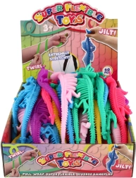 Пъстроцветна антистрес играчка във формата на скелет на динозавър от приятно мек силикон, идеална за стискане, разтягане и успокояване при стрес. Дължина 22 см, предлага се в 6 наситени цвята, чудесна за деца и възрастни като фиджет играчка за освобождаване на напрежението.