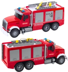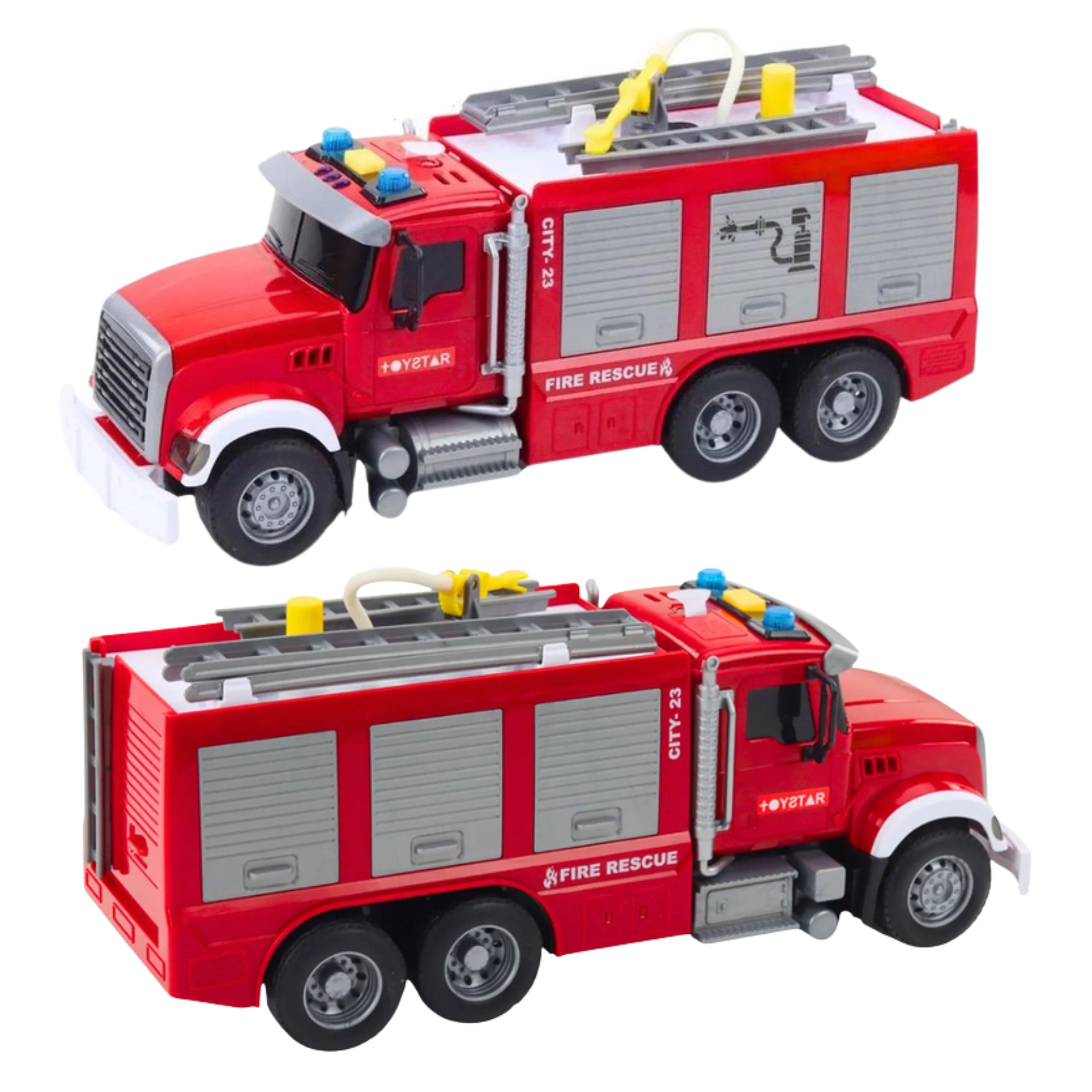 - Пожарна кола с водно пръскане, резервоар за вода, гъвкав маркуч с накрайник, бутон/помпа за изпомпване, интерактивни бутони за светлини и звуци