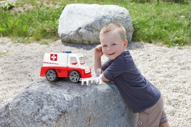 Здрава пластмасова линейка LENA TRUXX за малки спасители, с механична функционалност, отварящи се врати и повдигаща се кабина. В комплекта има фигурка на спасител и носилка за реалистична игра. Дължина 29 cm, подходяща от 2 години, идеална за пясъчника и за дома, без батерии.