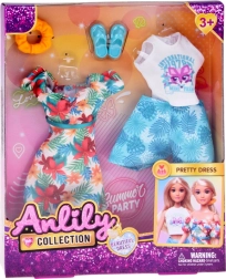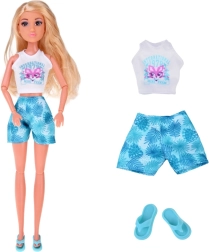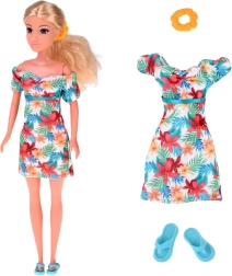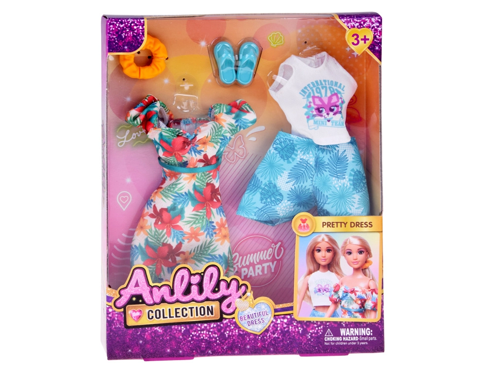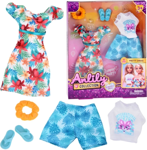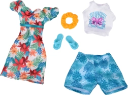 Комплектът предлага две летни стилизации: леки роклички с хавайски цветя, идеални за плажни разходки, и бяло късо топче с шорти с листен мотив за удобни дни, пълни с приключения. Перфектен за креативна игра, преобличане и разказване на летни истории.