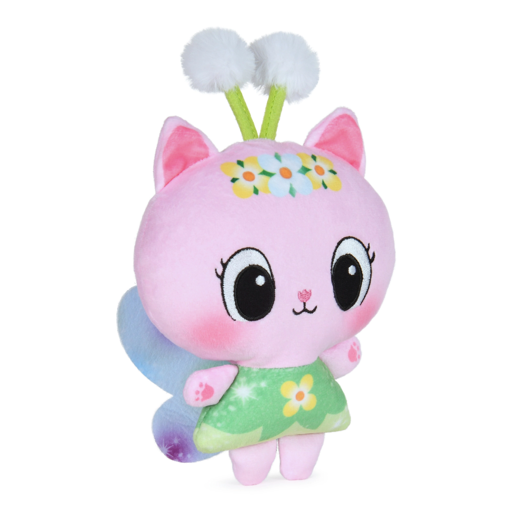 Очарователното плюшено котенце от популярния сериал Gabby’s Dollhouse ще зарадва всяко дете. Има меко телце, бродирани детайли на лицето, зелена рокличка с цветя и нежни крилца. Благодарение на автентичния дизайн по сериала е идеално както за игра, така и за гушкане.