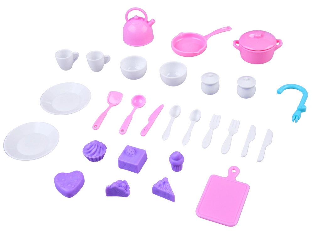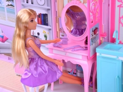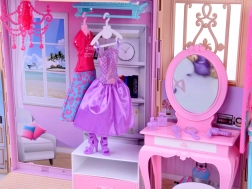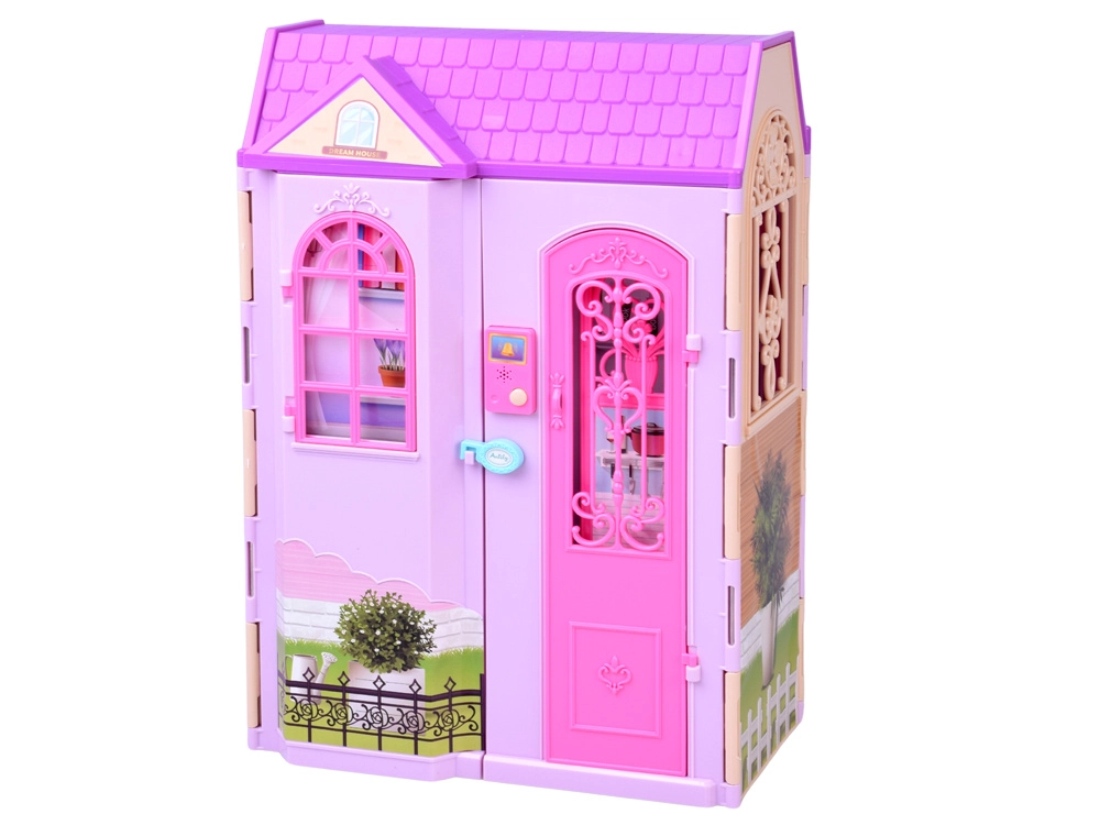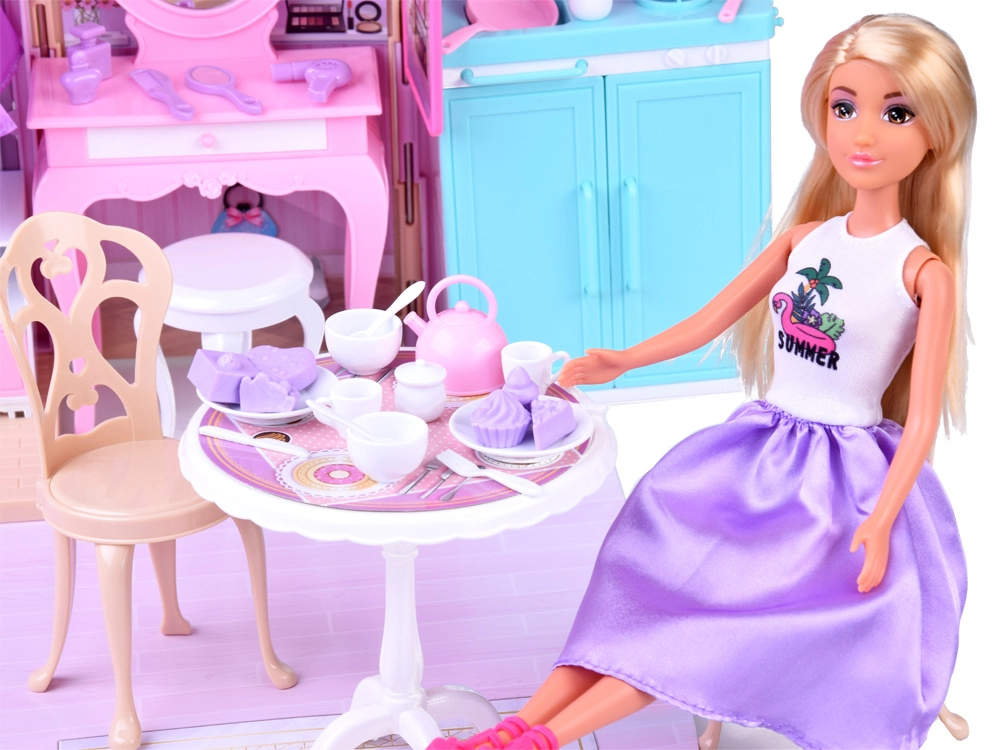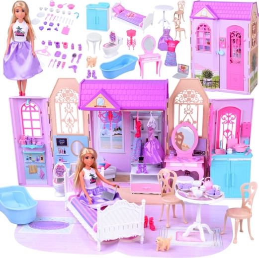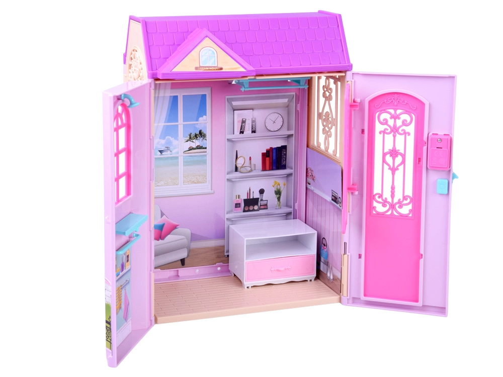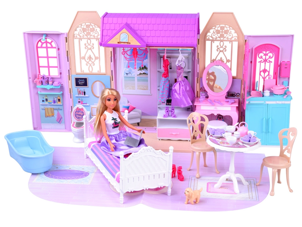 Сгъваемата розово-лилава къщичка е проектирана като практично куфарче, което децата лесно носят в детската градина, на ваканция или на гости. След разгъване създава уютен мини дом с три напълно оборудвани зони: баня за дълги къпания, спалня с тоалетка за стилизиране и отдих и кухня – сърцето на всяка къща.