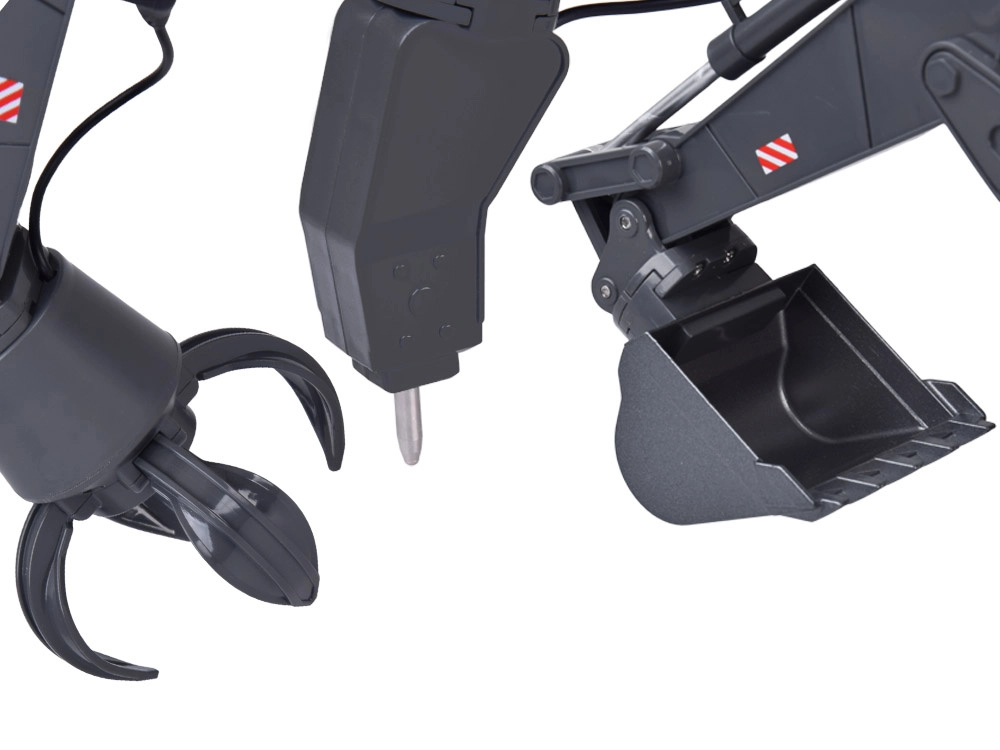 В комплекта има три сменяеми приставки – кофа, грайфер и demolition чук – които лесно адаптират багера към различни задачи. LED осветление и звукови ефекти могат да се включват и изключват. Металната кофа, пластмасовата кабина и здравата изработка гарантират дълготрайно забавление.