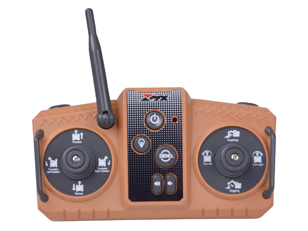 Двуистовият контролер предлага прецизно управление на веригите, завъртането на кабината и движенията на стрелата. Функцията DEMO показва всичко с едно натискане.