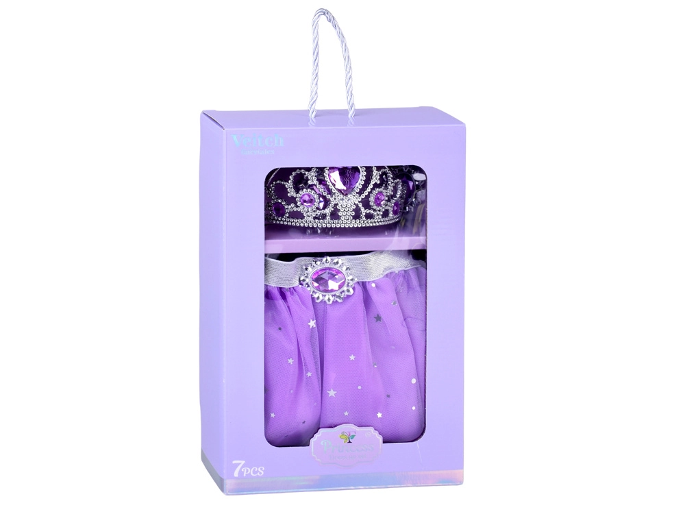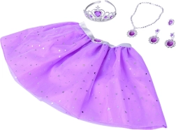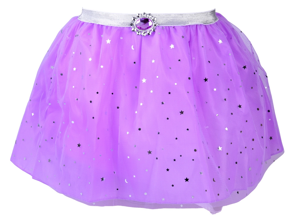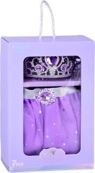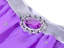Превърнете всяко преобличане във вълшебен бал. Лилавата тюлена пола със сияйни звезди и полумесеци очарова от пръв поглед, а сребърната корона, колието, пръстенът и висящите обеци с лилави камъчета допълват кралската визия. Еластичната талия осигурява удобство и лесно обличане.