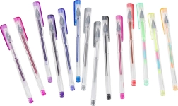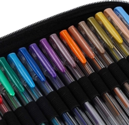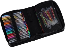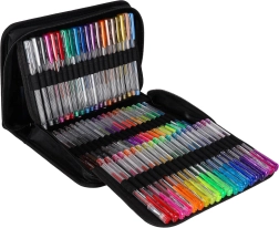 Открийте универсален сет за училище, офис и свободно време: 100 гел химикалки в богата палитра от цветове и ефекти, плюс 100 резервни пълнителя. Прегледният разгъваем несесер с цип държи всяка химикалка на мястото ѝ, така че всички цветове са винаги под ръка и безопасно съхранени.