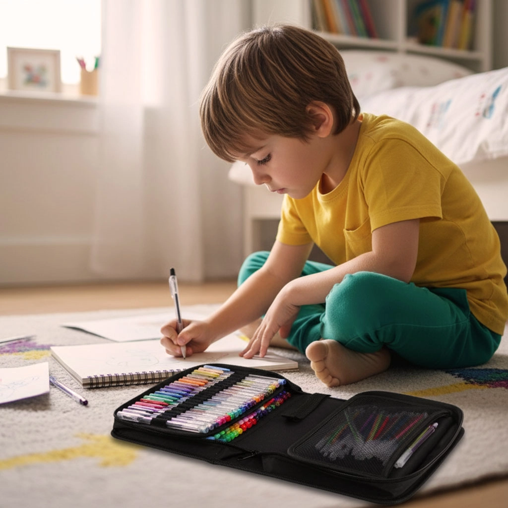 Разгъваемият несесер с еластични държачи поддържа химикалките подредени и защитени. Лесно ги вземате навсякъде със себе си.