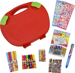 Вътре ще откриете богата колекция от творчески материали в ярки цветове: ароматни флумастери, ароматни моливи, пастели, книжки за оцветяване с весели герои и цветни стикери за довършване на творбите. Всичко е проектирано да бъде нетоксично, удобно за детска ръка и да насърчава развитието на въображението и фината моторика.