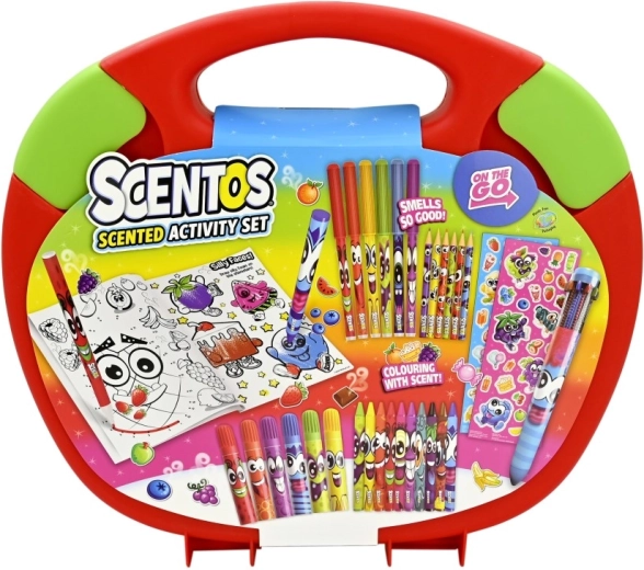 Ароматното креативно куфарче Scentos е чудесен избор за деца, които обичат цветовете, ароматите и творенето. Компактното червено куфарче със зелени дръжки е лесно за пренасяне, има удобна ръкохватка и сигурно закопчаване, така че всички принадлежности ще останат подредени заедно.