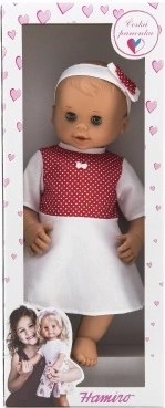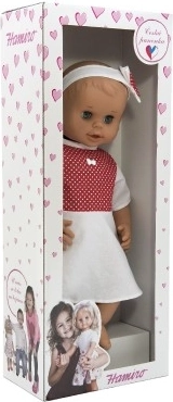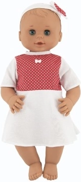 Куклата е перфектна за малки деца още от раждането, благодарение на своята безопасна конструкция. Облечена е в бяла рокличка с червени точки, която придава миловиден вид. Мигащите очи добавят автентичност и интерактивност.