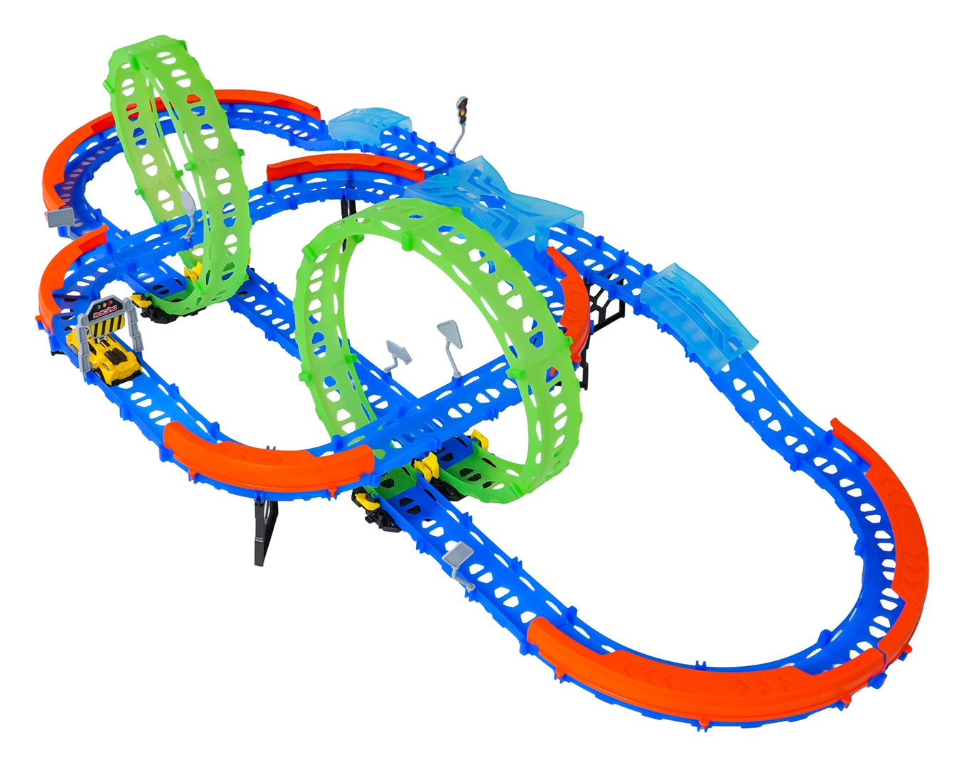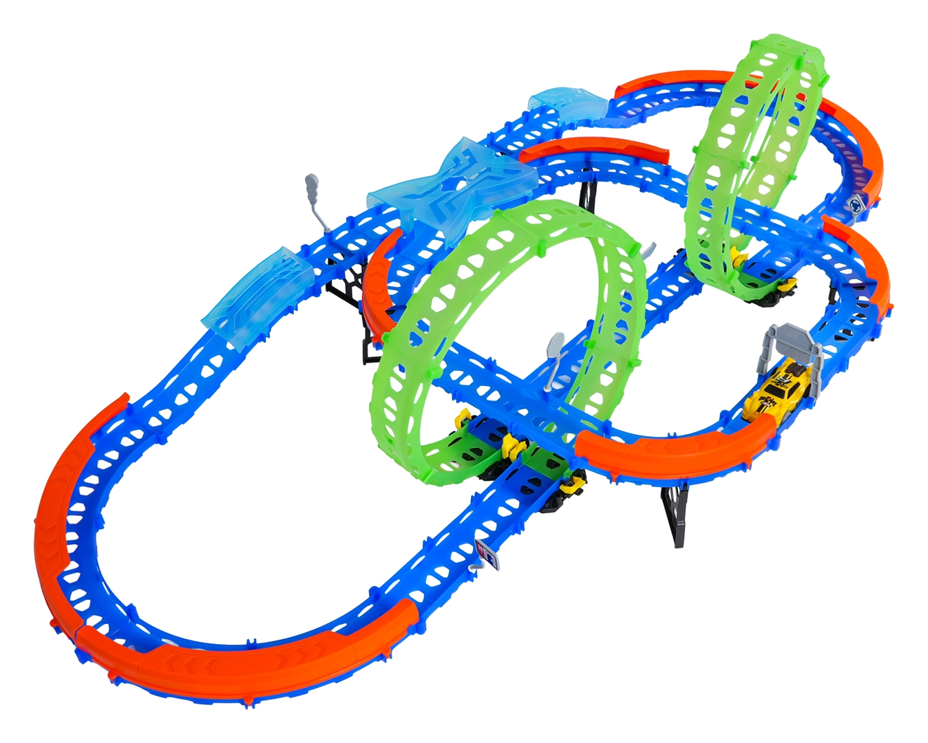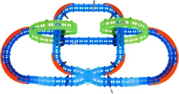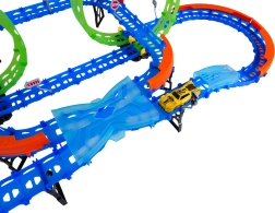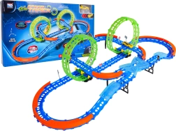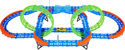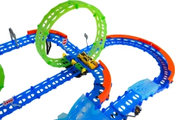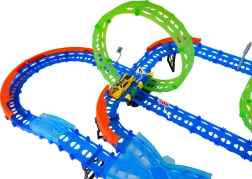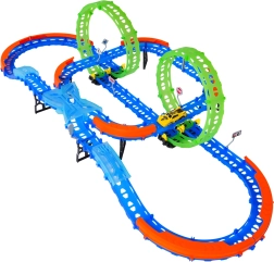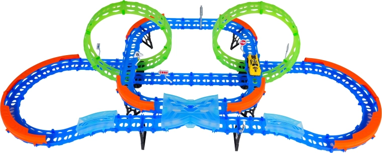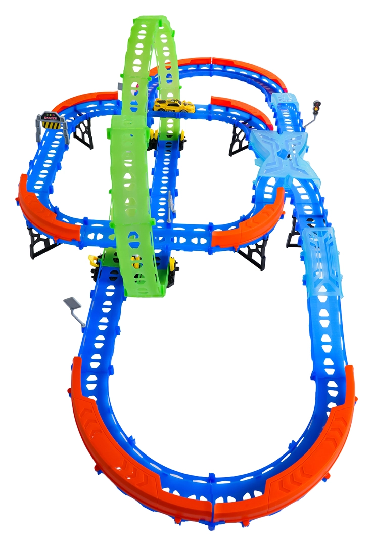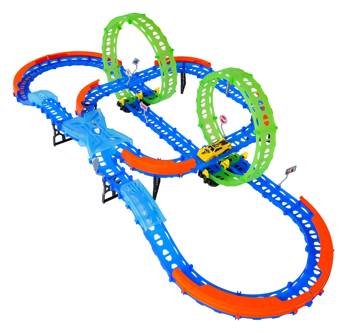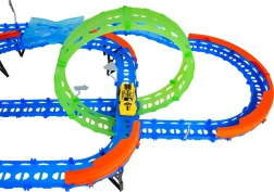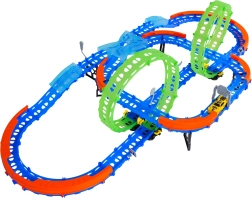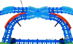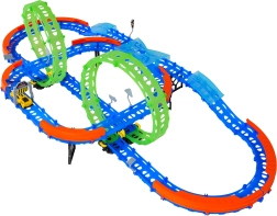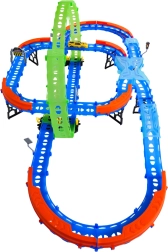 Постройте цветна писта с мостове, завои и две примки и наблюдавайте как количката профучава с висока скорост. Флуоресцентните елементи светят в тъмното след осветяване, което прави състезанията още по-динамични и забавни.