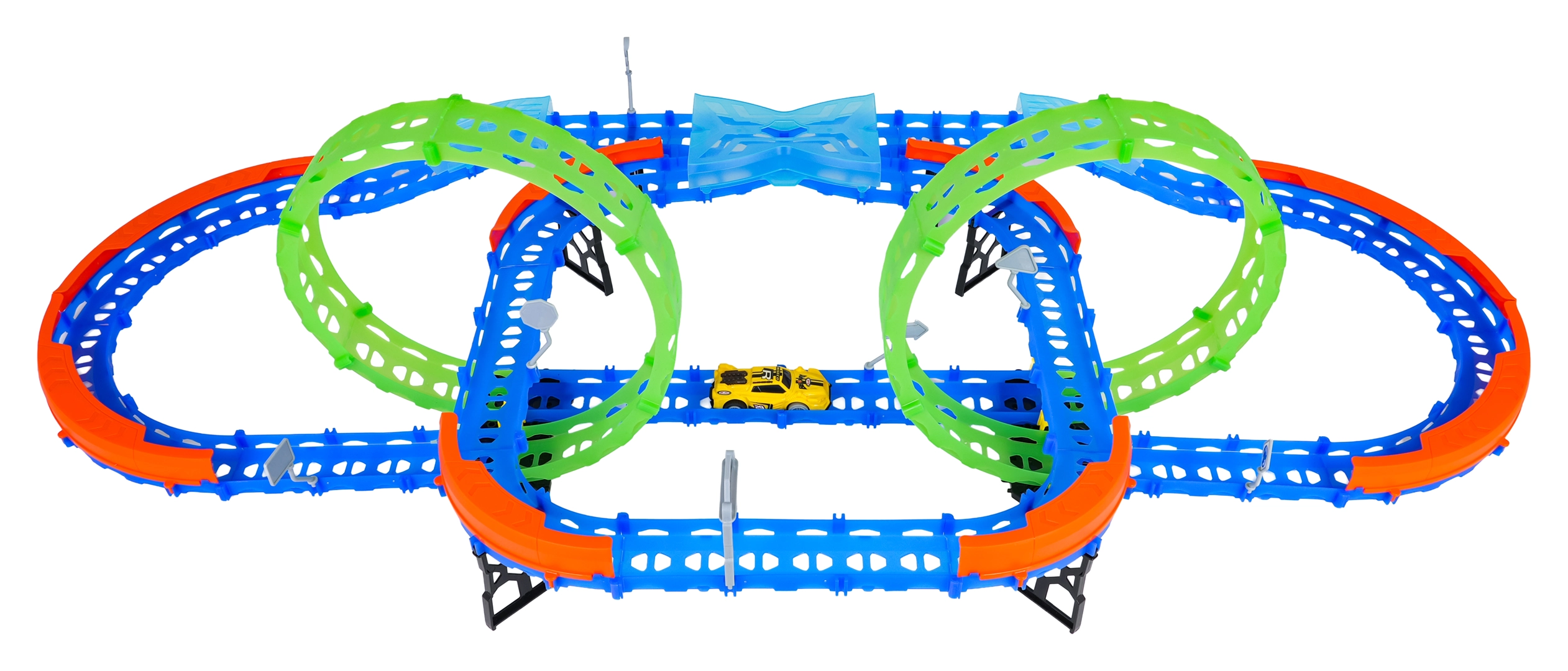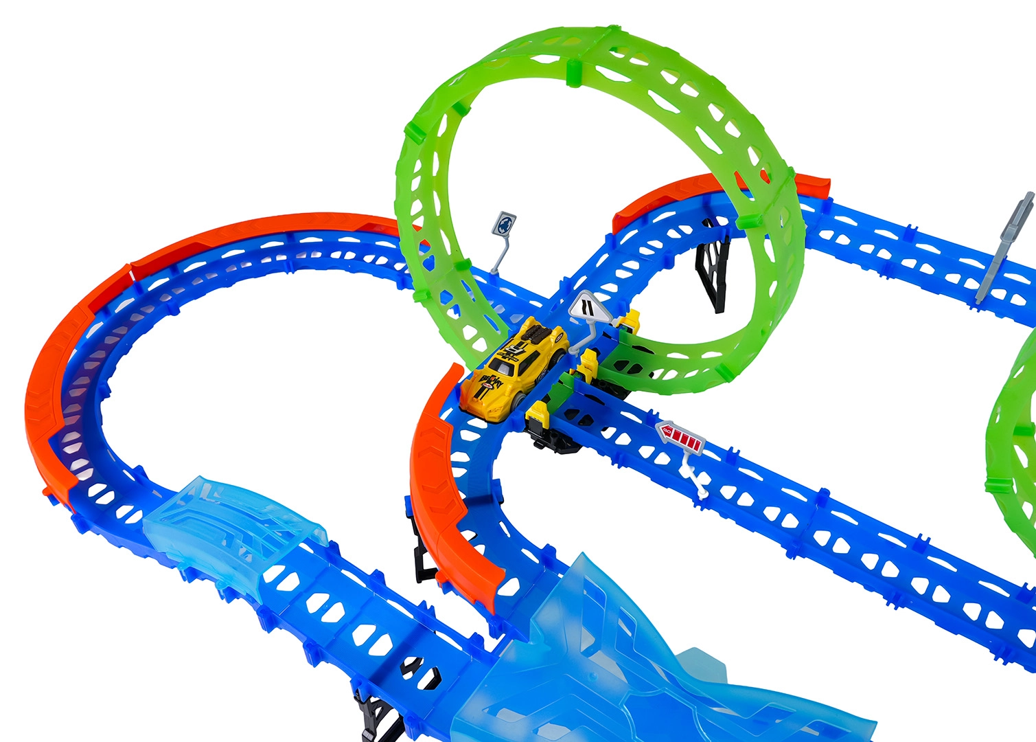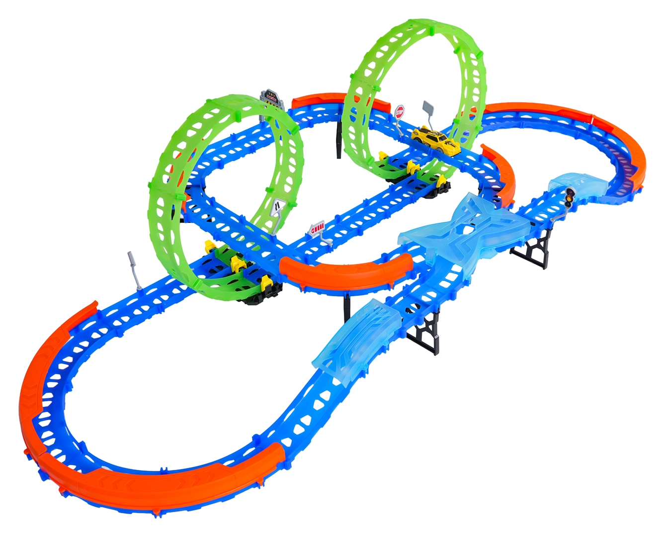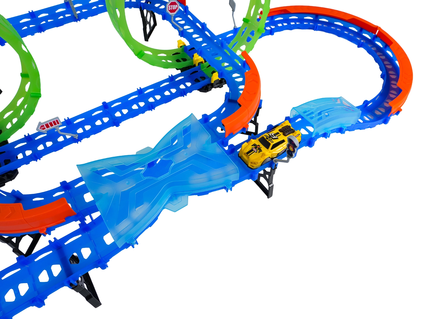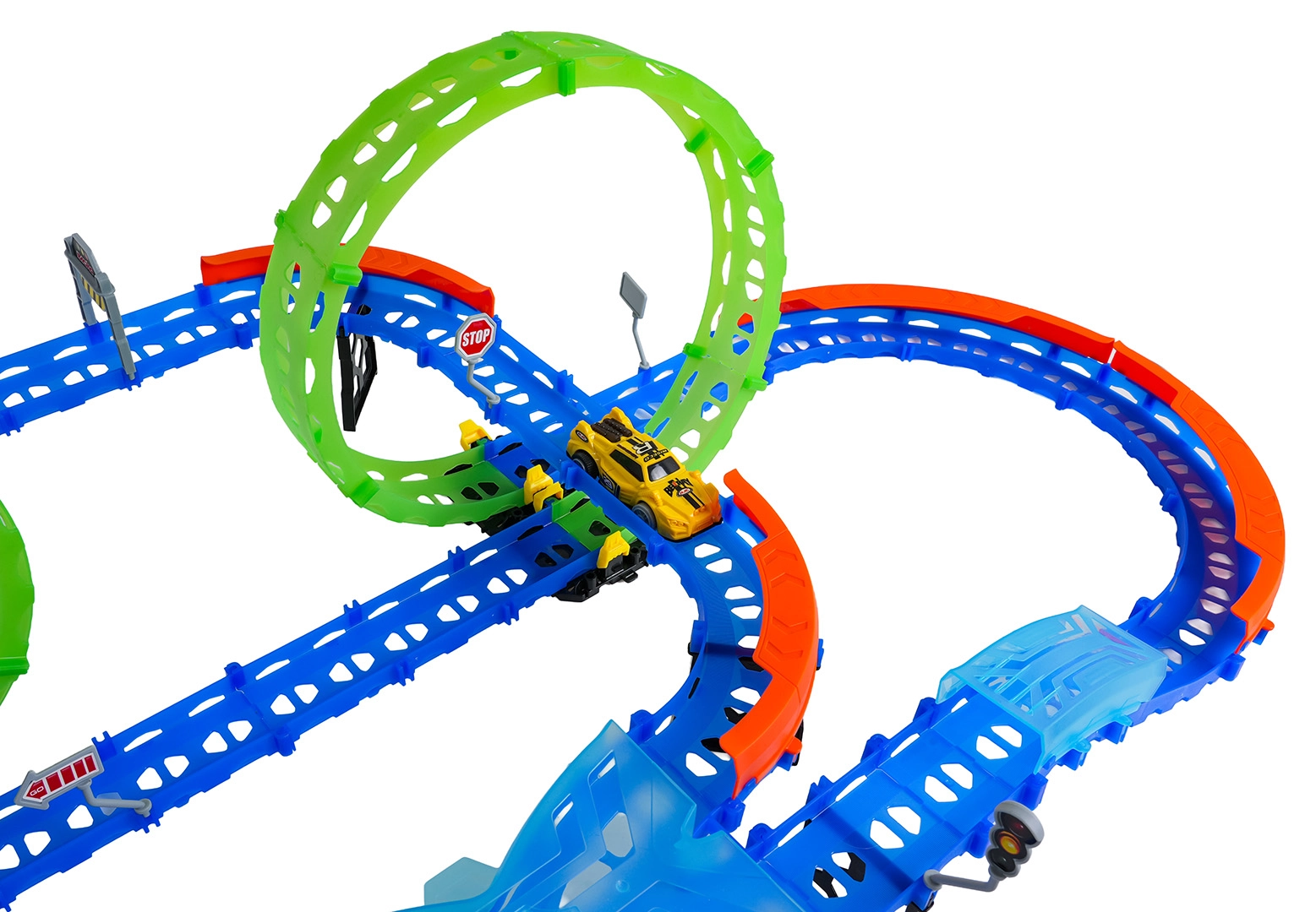 Постройте цветна писта с мостове, завои и две примки и наблюдавайте как количката профучава с висока скорост. Флуоресцентните елементи светят в тъмното след осветяване, което прави състезанията още по-динамични и забавни.