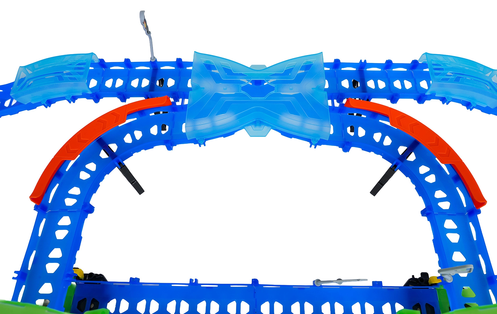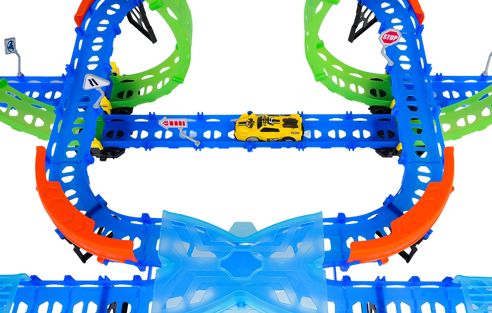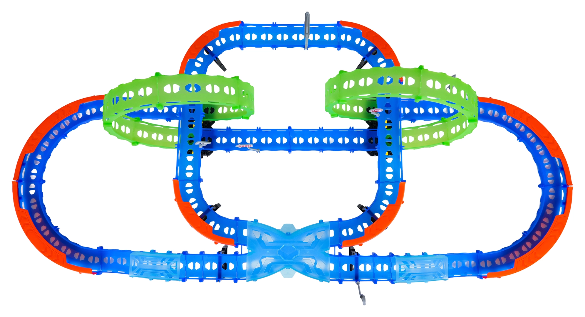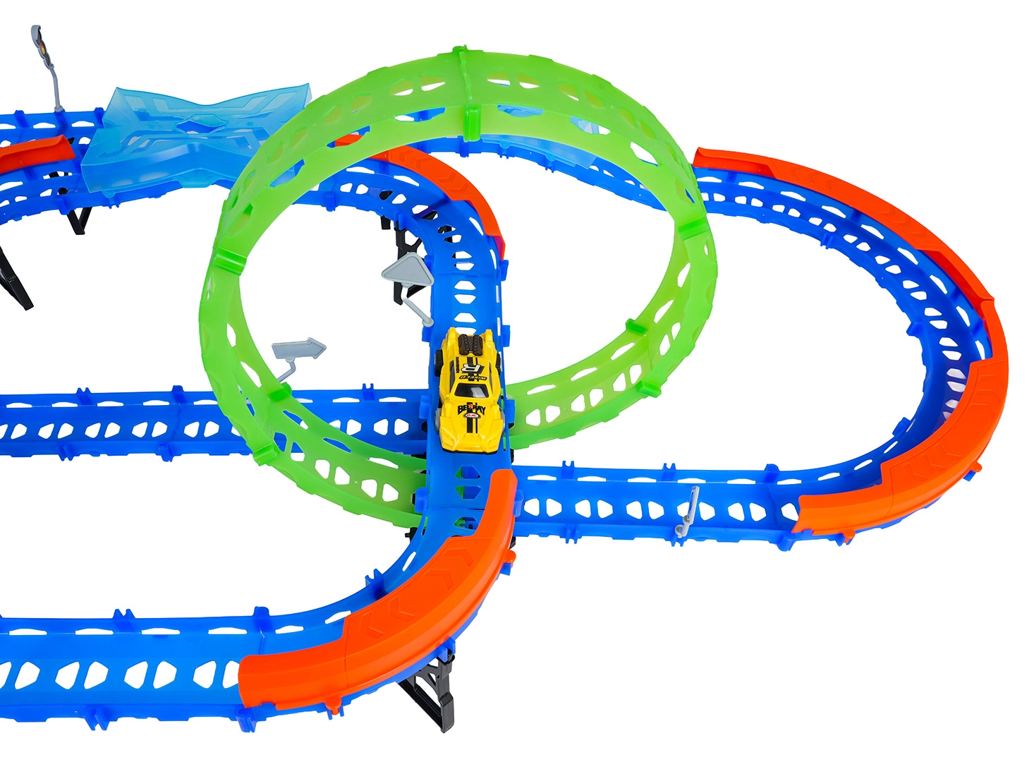 Постройте цветна писта с мостове, завои и две примки и наблюдавайте как количката профучава с висока скорост. Флуоресцентните елементи светят в тъмното след осветяване, което прави състезанията още по-динамични и забавни.