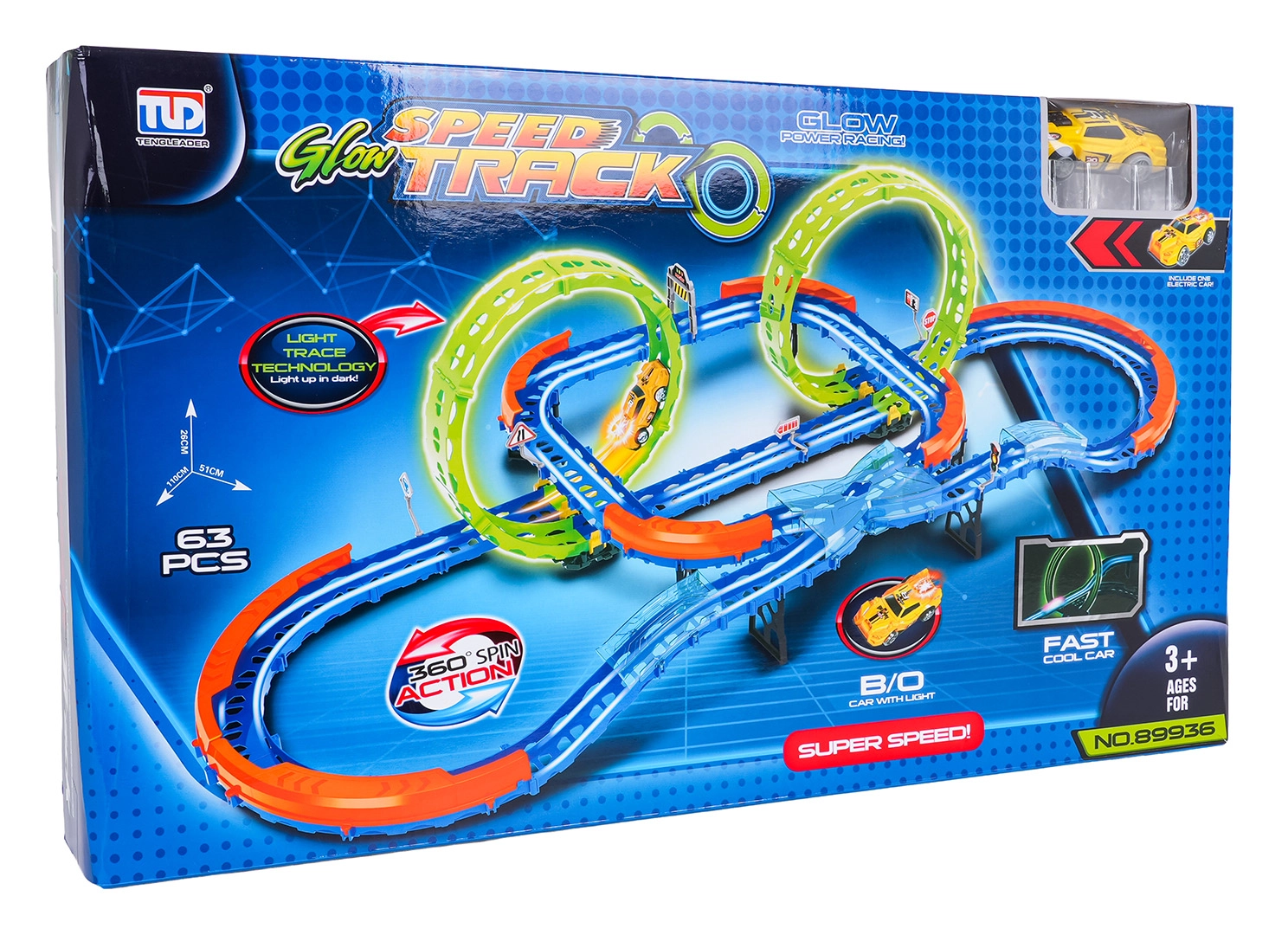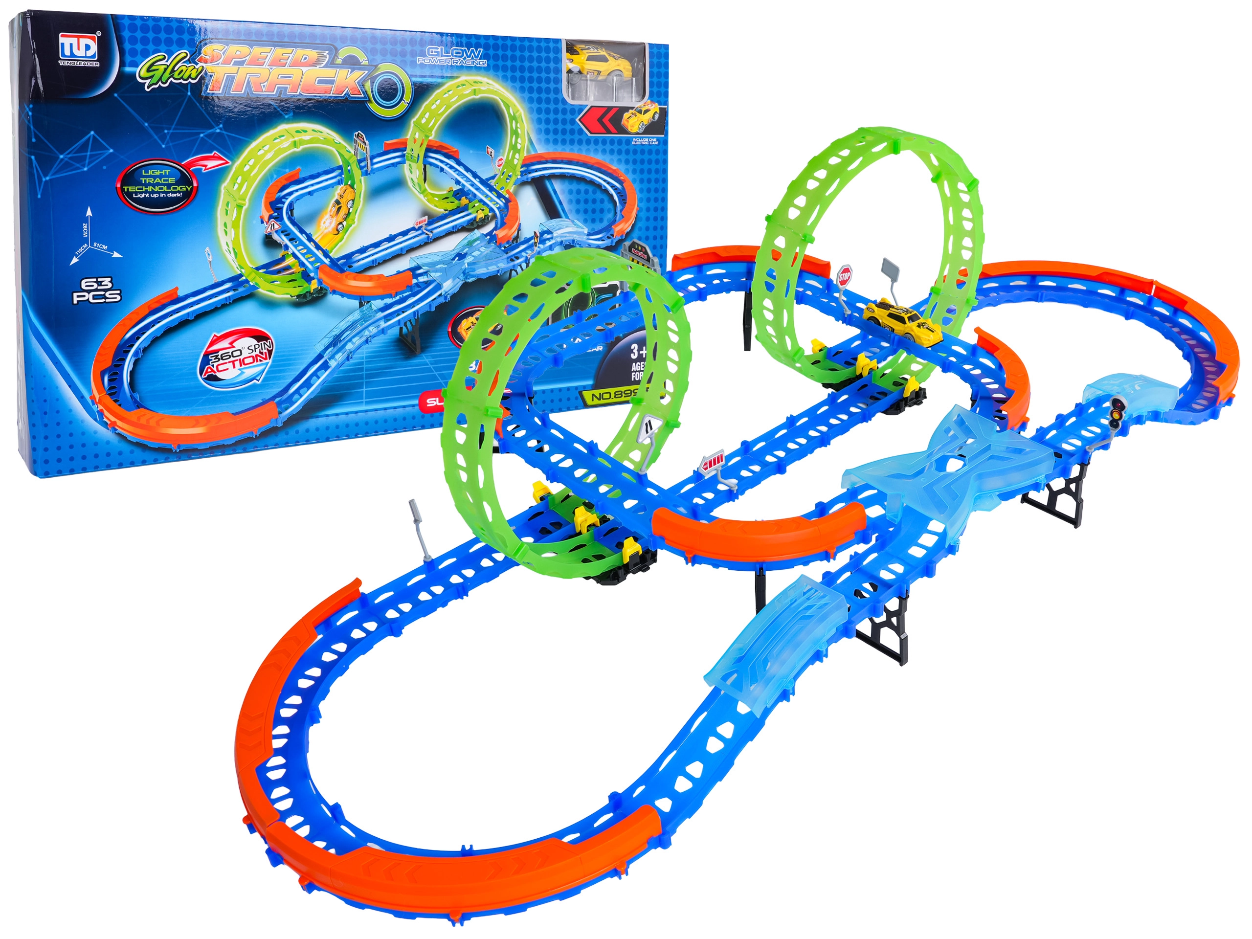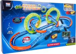 Разпалете въображението с забавен състезателен комплект за деца от 3 години. Това светещо състезателно трасе предлага 2 флуоресцентни примки 360°, остри завои с предпазни бариери и бърза количка с осветление. Благодарение на 63 лесно свързващи се части децата ще построят собствена писта и ще се насладят на вълнуващо каране дори в тъмното.