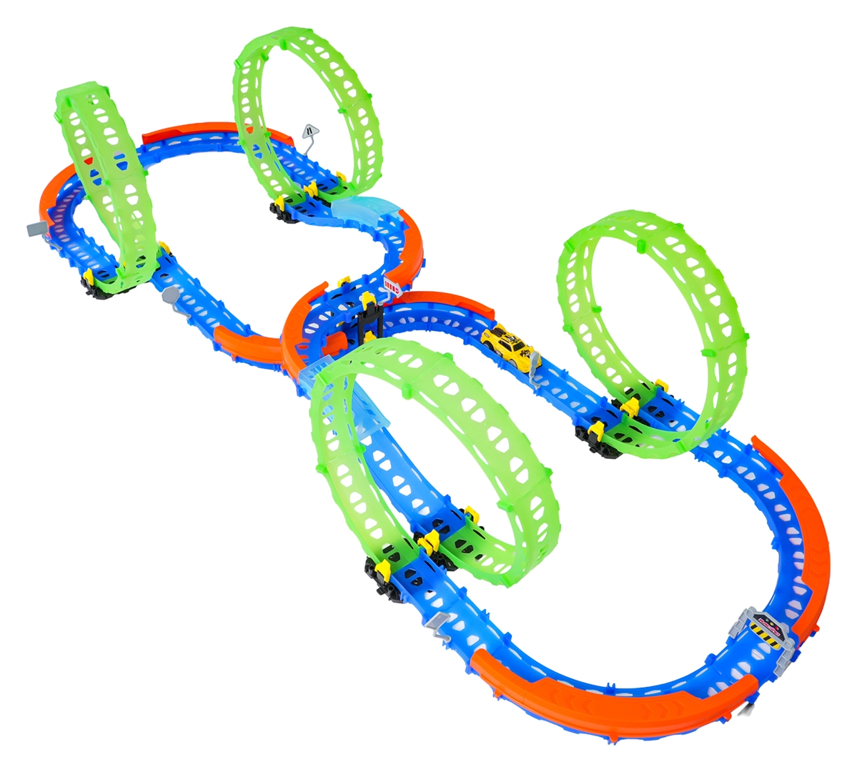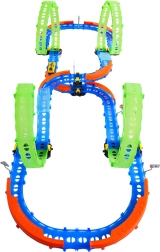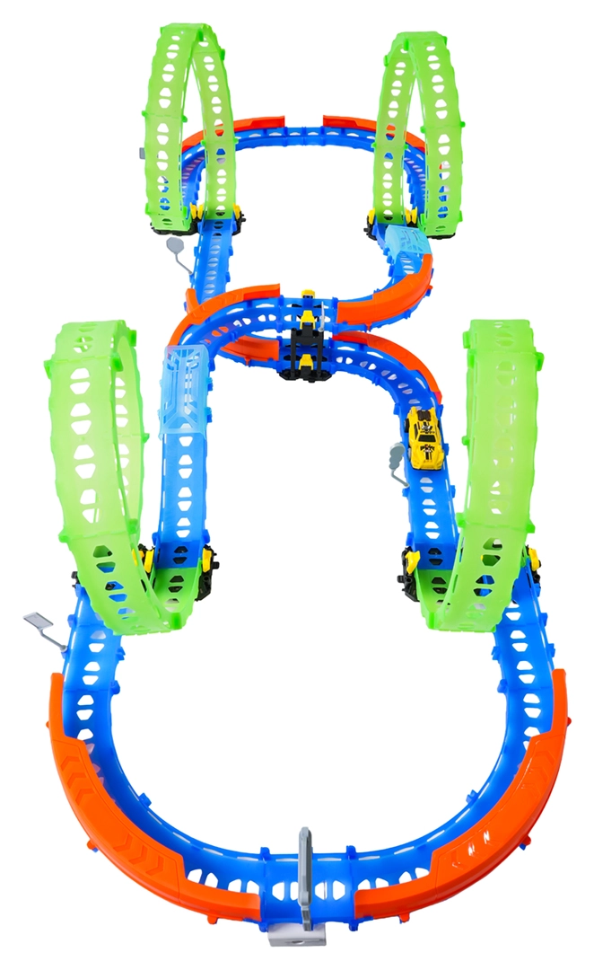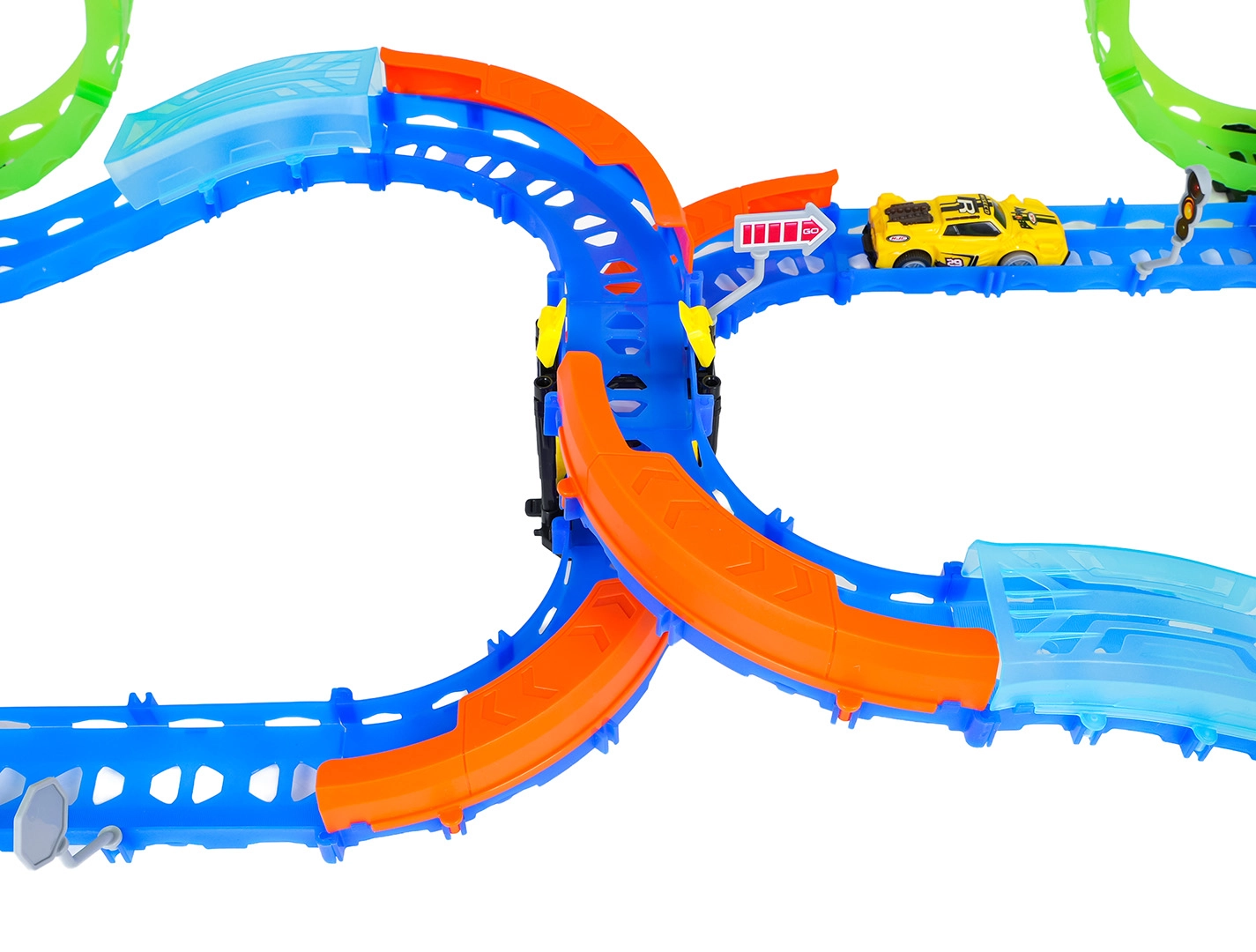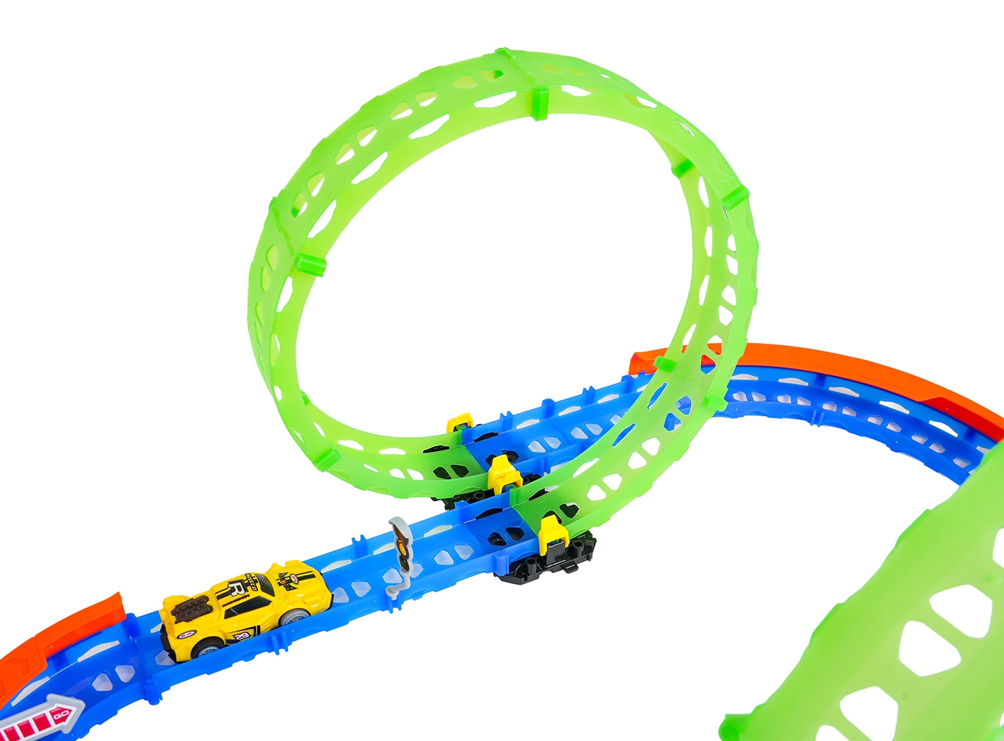 Тази цветна състезателна писта предлага страхотни каскадни карания и креативно строене. Благодарение на флуоресцентните примки и светлинния ефект на количката изпъква особено в тъмното, където се превръща в сияйно трасе, пълно с напрежение. Здравите предпазни бариери в завоите помагат да се задържи количката сигурно на пистата.