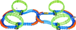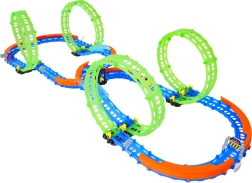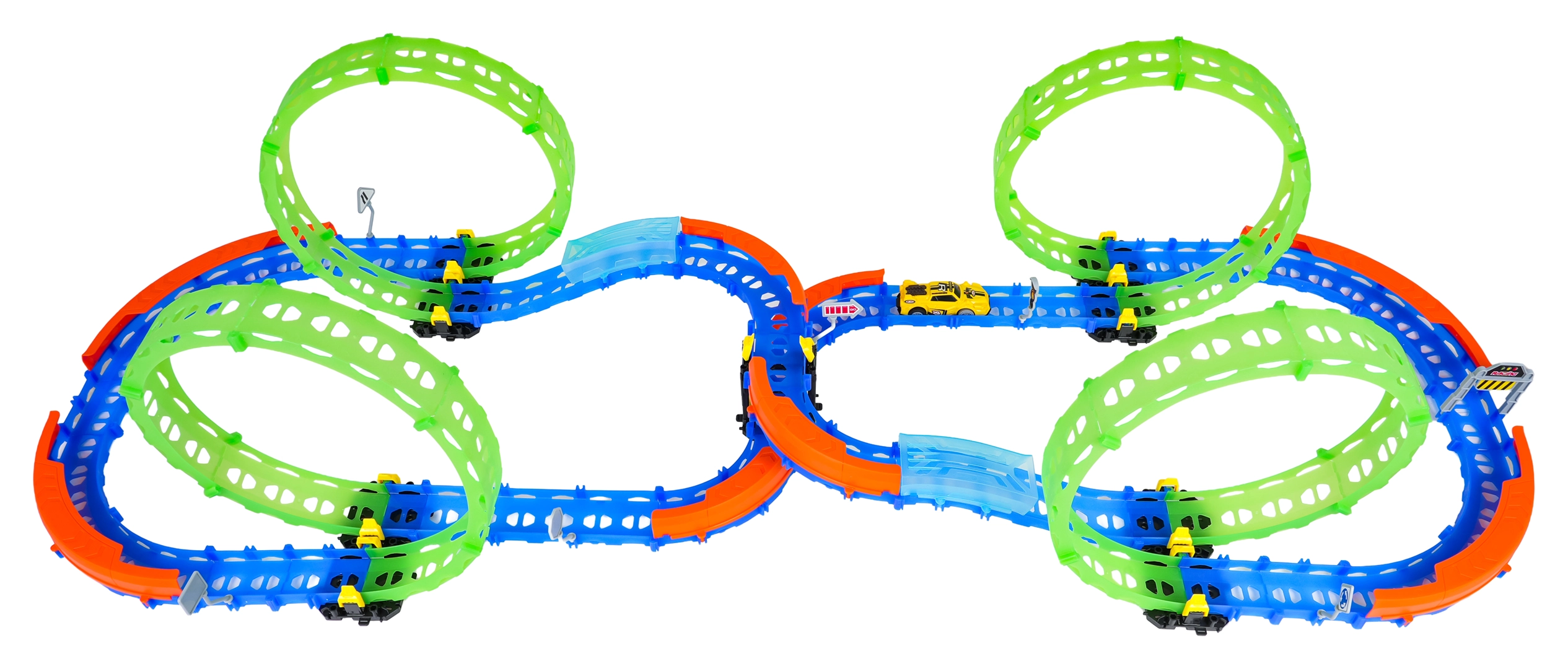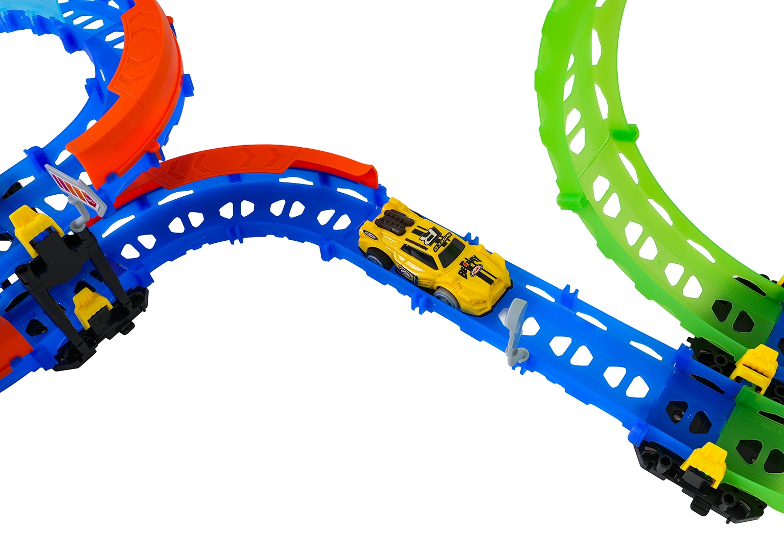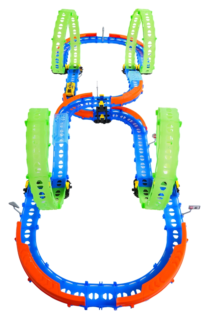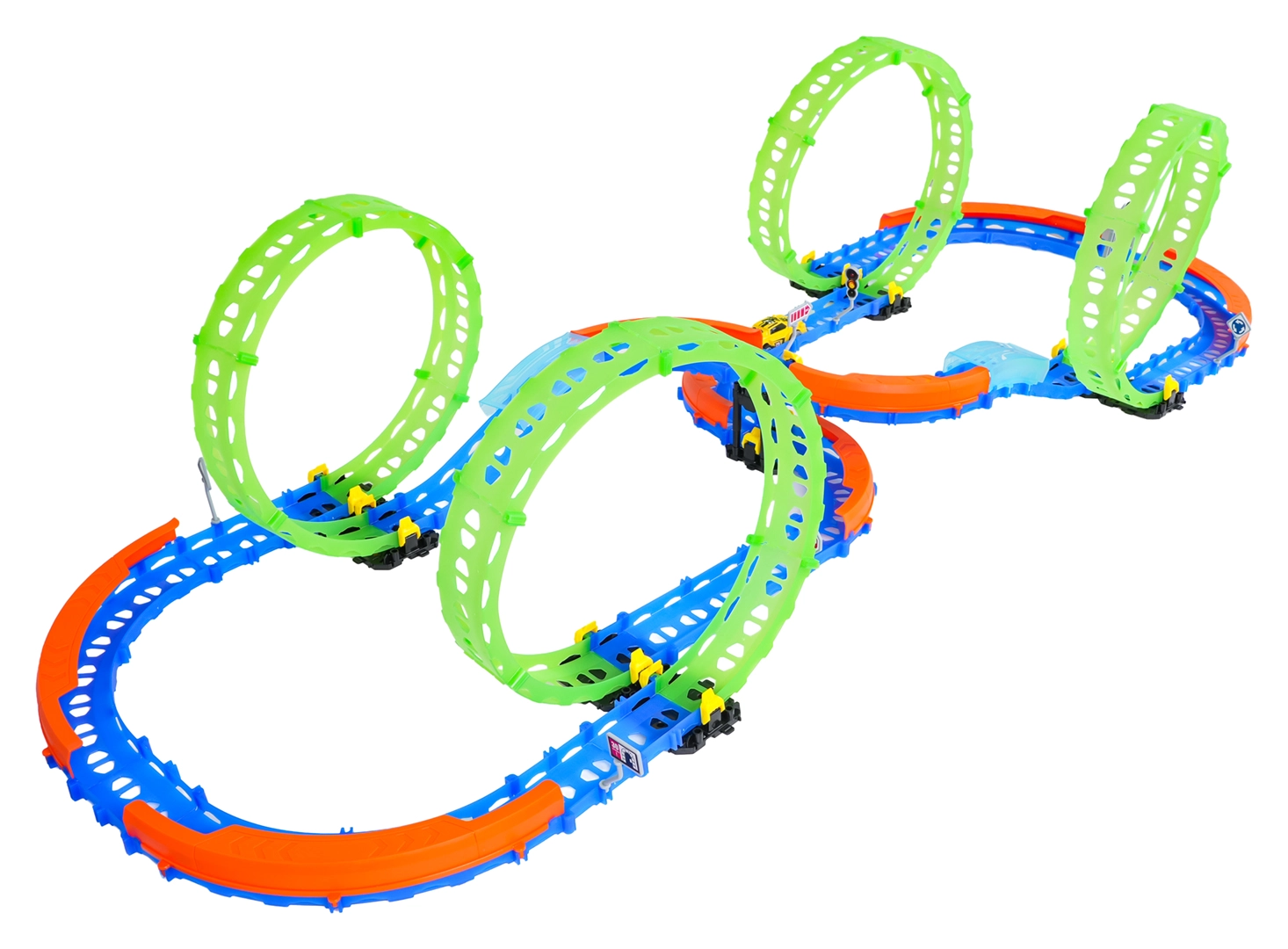 Тази цветна състезателна писта предлага страхотни каскадни карания и креативно строене. Благодарение на флуоресцентните примки и светлинния ефект на количката изпъква особено в тъмното, където се превръща в сияйно трасе, пълно с напрежение. Здравите предпазни бариери в завоите помагат да се задържи количката сигурно на пистата.