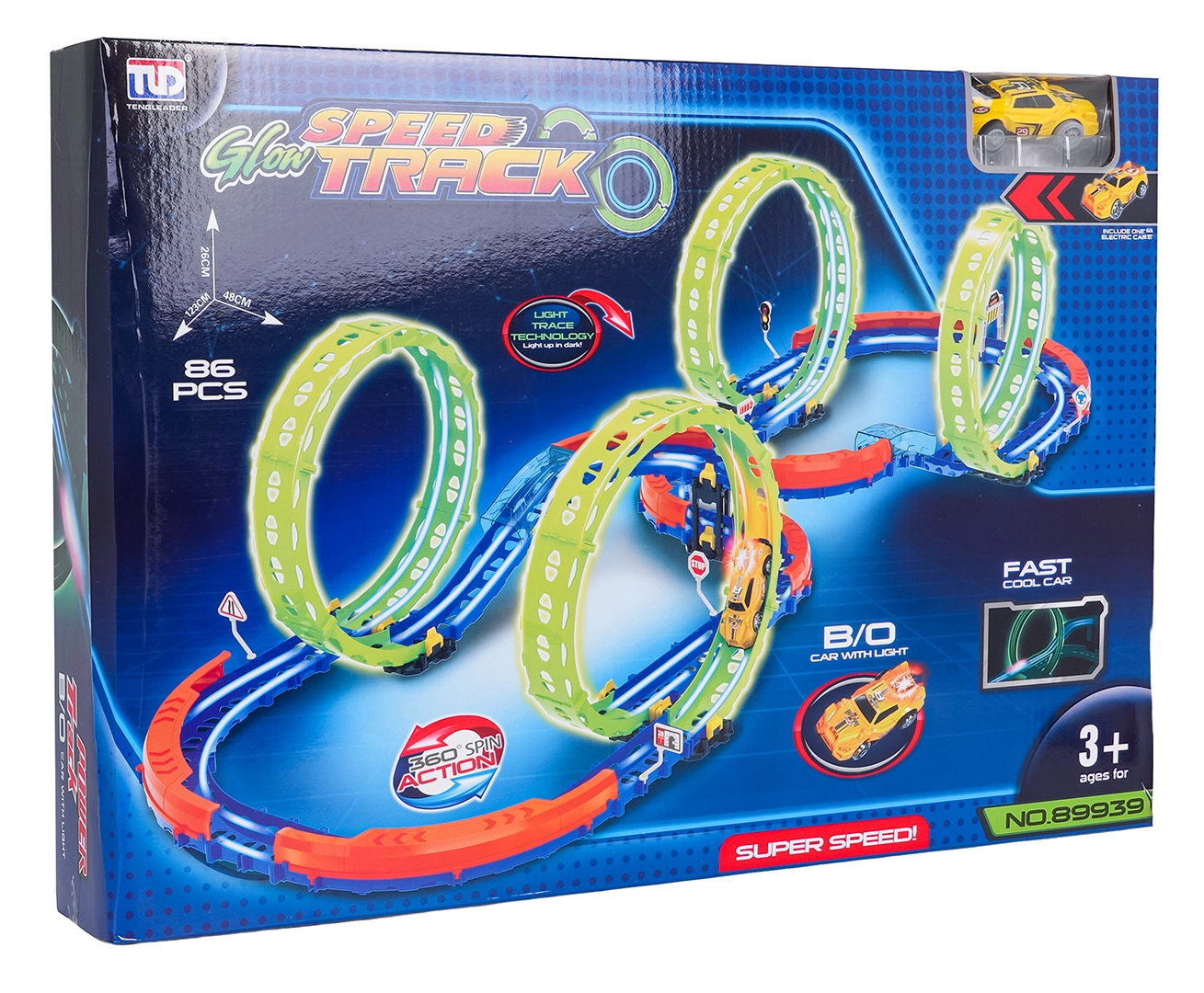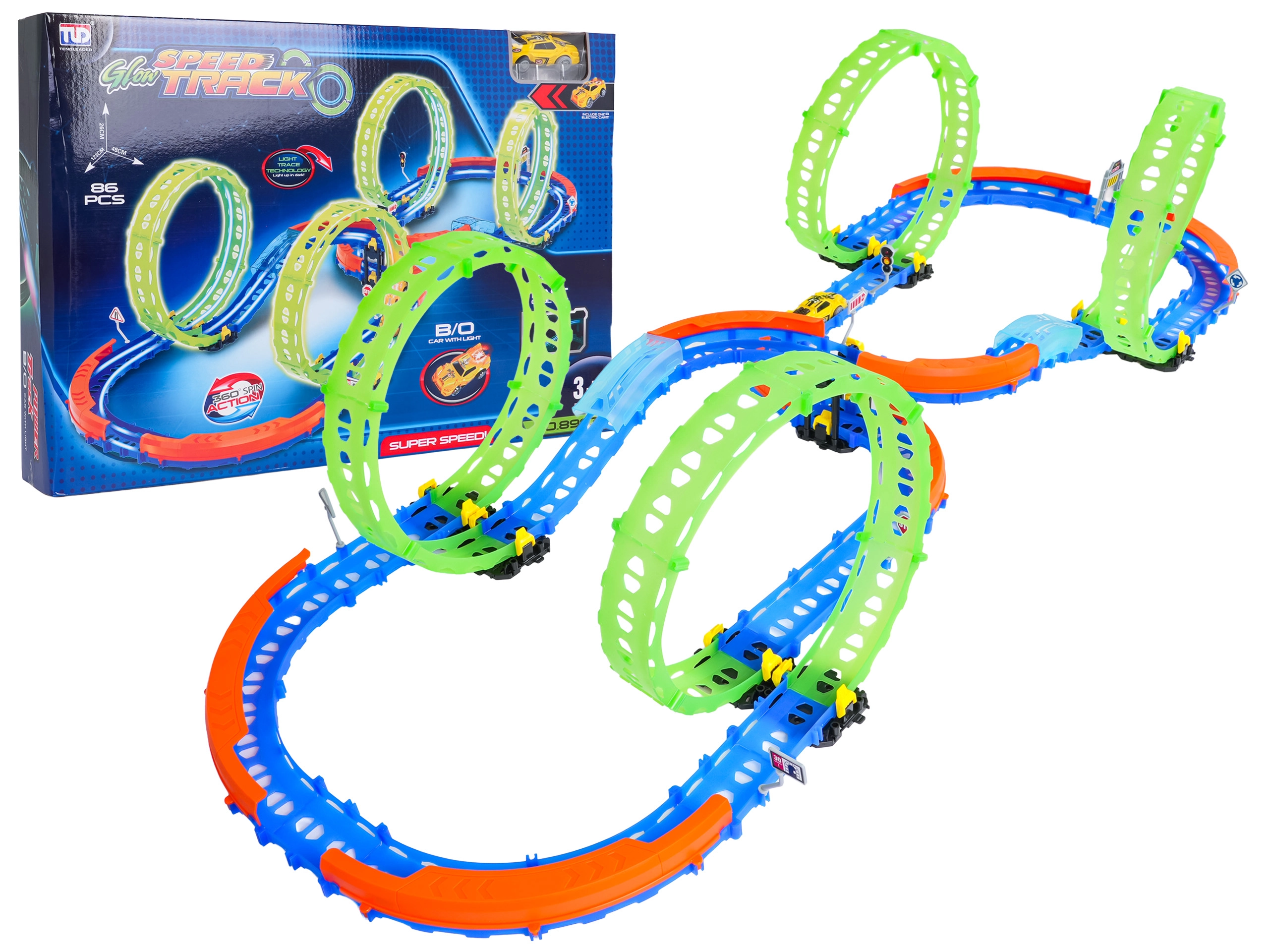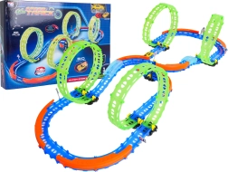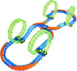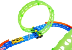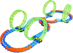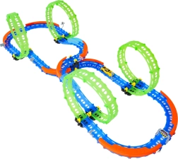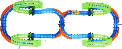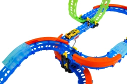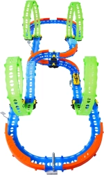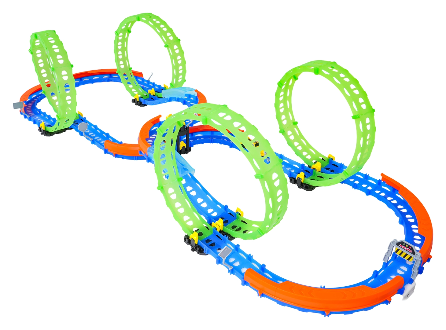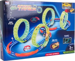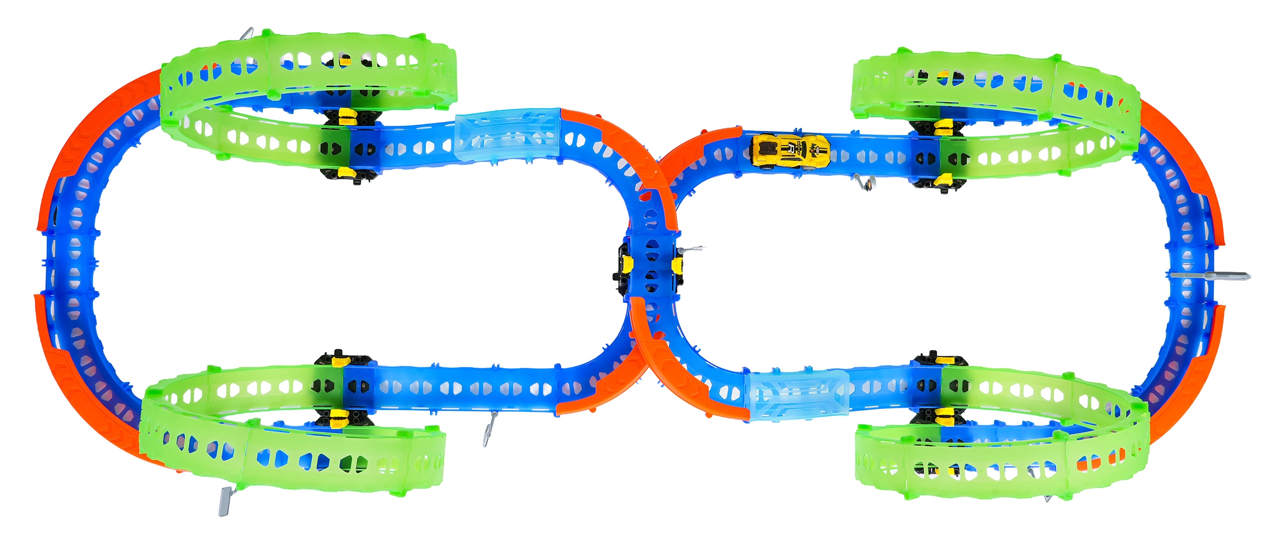 Тази цветна състезателна писта предлага страхотни каскадни карания и креативно строене. Благодарение на флуоресцентните примки и светлинния ефект на количката изпъква особено в тъмното, където се превръща в сияйно трасе, пълно с напрежение. Здравите предпазни бариери в завоите помагат да се задържи количката сигурно на пистата.