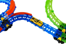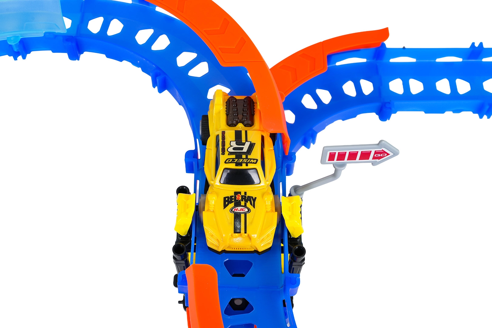 Комплектът съдържа 86 елемента, включително конструктивни части на пистата, количка, декоративни стикери и пътни знаци. Лесното snap-fit свързване позволява бърз монтаж и промени в подредбата – от прави участъци и остри завои до четири 360° loop-de-loop. Количката се захранва с 2× AA 1,5 V батерии (не са включени).