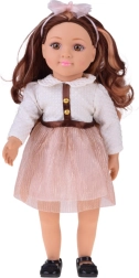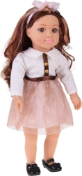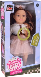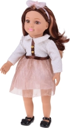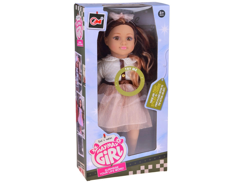 Очарователната кукла MAY MAY GIRL се отличава с комбинация от реалистични детайли и качествена изработка. Бялото структурирано горнище със златисти копчета, блестящата розова пола с колан и диадемата с панделка оформят елегантен моден комплект, който стимулира въображението и стилното преобличане.